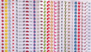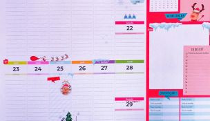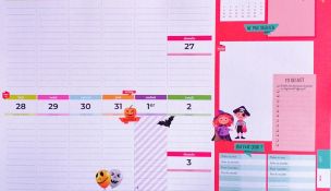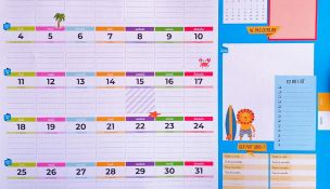 Une grande planche de stickers vient compléter cet agenda. Les 27 motifs sont les suivants : un point d’exclamation rouge, un point d’exclamation jaune, un drapeau, une licorne, un vélo, des baskets, une voiture, un avion, un cadeau, des bougies, des ballons, une croix verte, une mallette de premier secours, des tongs, une bouée, un pingouin, un bonhomme de neige, un cactus, un caddie, une palette de peinture, un sac à dos, un cahier, des crayons et des ciseaux, une guitare, une télé et une manette. Soit 540 stickers, 20 identiques par colonne.