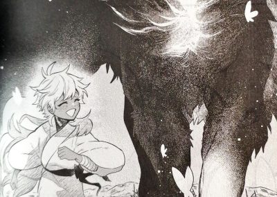 Les villageois honnissent Tsubaki pour son apparence ; ils la diabolisent, tandis qu’ils révèrent le Dieu-Loup nanti de sa fourrure rouge flamboyant. Couleur qui paraît répugnante dans d’autres régions, autant auprès des hommes que de ses congénères. Tous deux ont récolté l’ire des villageois pour la même raison, une forme de xénophobie cruelle. Le Dieu-Loup y repense, mais préfère ne pas en parler à Tsubaki.