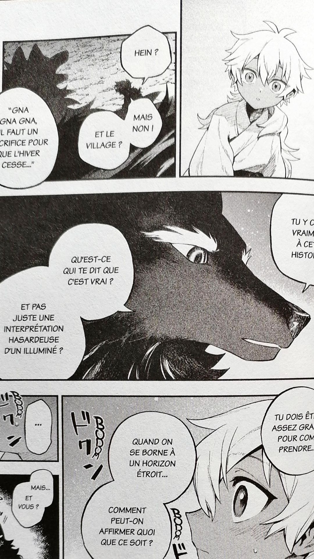 Le doyen du village l’interprète autrement. Les victuailles ne sont sans doute pas ce qu’attend le Dieu-Loup, alors il décide de sacrifier un être humain. Après tout, un marchand de passage a échangé l’enfant qu’il transportait contre du foin pour son cheval. Cet enfant n’est pas des leurs et suscite leur défiance. C’est une aubaine de s’en débarrasser tout en libérant le village de cette malédiction !