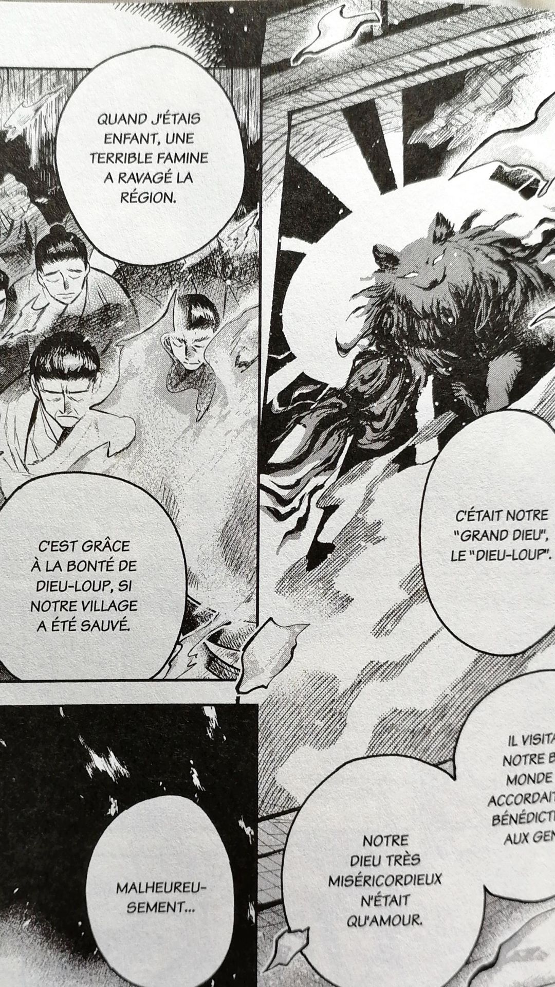 Ce manga nous démontre combien l’humanité est cruelle. Ce n’est pas le Dieu-Loup le monstre de l’histoire, mais bien les humains. Ils n’ont aucun scrupule à haïr un enfant pour sa différence, puis le sacrifier sans scrupules. Ils le tolèrent dans leur village, mais lui font bien sentir qu’il ne leur sert à rien. Insultes, faim et froid jalonnent le quotidien de Tsubaki.