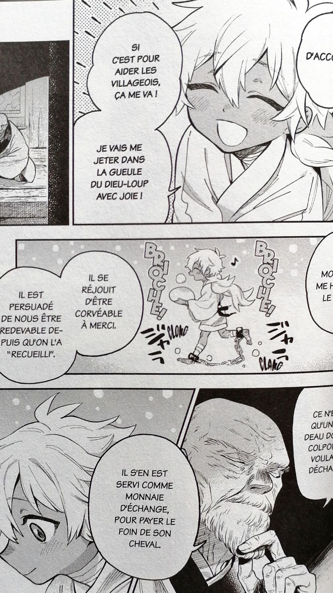 Après l’avoir nourri d’une brioche, le doyen explique à l’enfant enchaîné qu’il doit se sacrifier au Dieu-Loup. Ce dernier n’objecte pas et témoigne naïvement sa reconnaissance : s’il peut aider le village en offrant sa vie, il le fera. À cause de sa peau basanée, ses yeux dorés et ses cheveux blancs, aucun village n’a voulu de lui, excepté celui-ci. Alors, même s’il marche pieds nus dans la neige, en haillons, le ventre vide, sale et solitaire ; il est heureux d’être parmi eux.