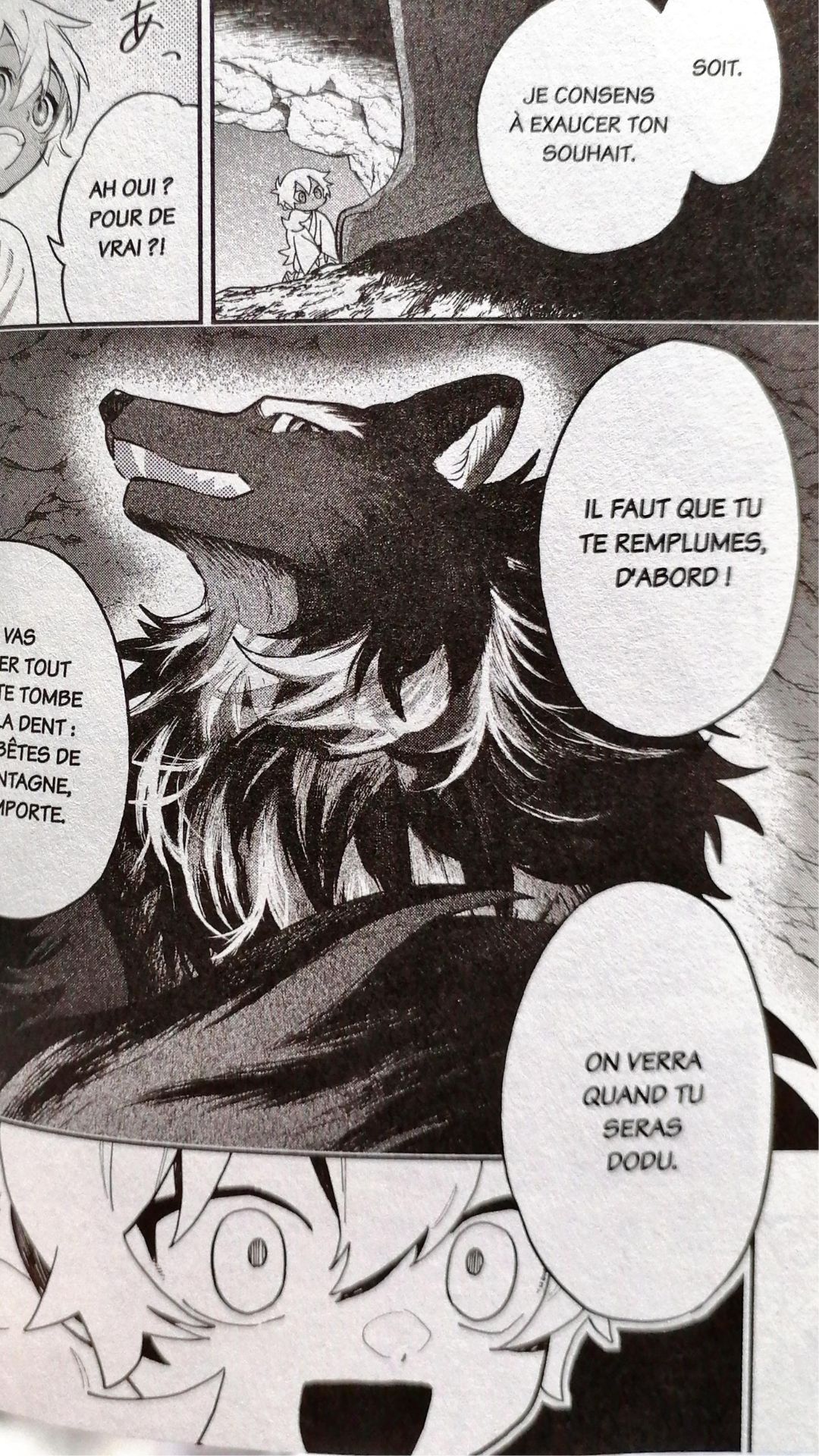 L’enfant, qui n’a pas encore de nom à ce moment précis, se fait attacher pour se faire dévorer. Mais, une fois que le Loup géant arrive, il est indigné. Comment ces humains ont-ils osé lui livrer un bambin en offrande ?! Il refuse de le manger. Catastrophé, l’enfant lui explique que la neige doit cesser, qu’il doit le dévorer pour sauver son village. Le Loup n’en croit rien, mais lui promet de le manger dans 1 mois, lorsqu’il sera remplumé…