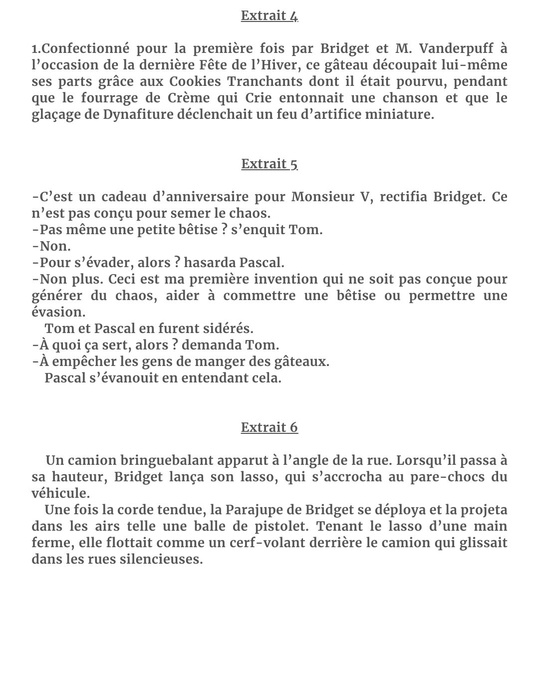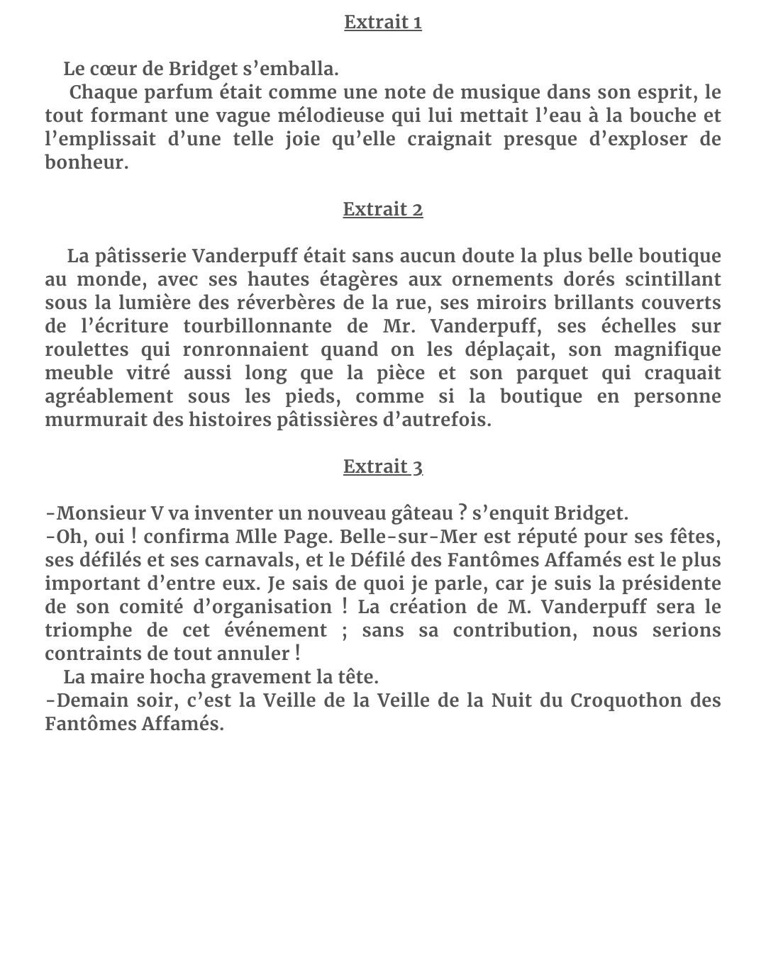 Énorme point fort de ce roman : son ambiance particulièrement chaleureuse. Bridget est la fille adoptive de Mr Vanderpuff, le meilleur pâtissier de Belle-sur-Mer ; au talent si exquis que les gens du monde entier se pressent pour obtenir une de ses créations : Splendiféroces, Délices Vanderpuff, Tartelettes Chouettes aux Framyrboises… Chaque mignardise est originale, à l’instar des créations de Bridget.