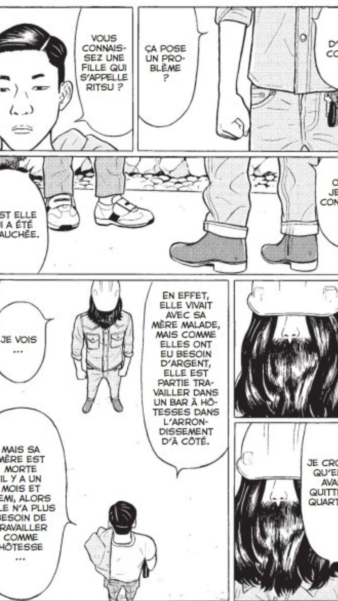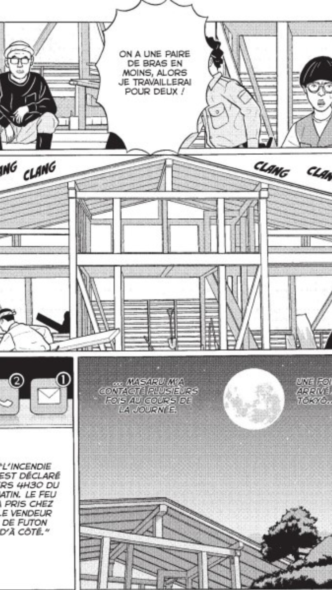 Le voisinage et les employés de la menuiserie sont également bien développés. Les dialogues sont sobres mais chargés de significations, souvent ponctués d’humour discret ou de remarques acérées sur la société japonaise contemporaine.