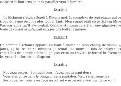 Mordecai, le PNJ qui leur sert de guide pour le tutoriel, évoque 13 niveaux dans le donjon, mais il y en a certainement plus. Si ce roman est bien accueilli, sa vulgarité m’a complètement refroidie. Par ailleurs, les règles sont décousues. Créer un jeu de survie exige de donner les mêmes chances à tous les joueurs. Si des gens sont chez eux, ils meurent désintégrés, tandis que ceux qui vivent à l’opposé en plein jour survivent dehors… Absurde. Idem : Carl doit trouver par lui-même le tutoriel sans quoi il ne peut pas accéder à ses coffres ni monter de niveau. Tout est mis en place pour tuer sans sommation sans laisser la moindre chance, alors que c’est la base du livre.