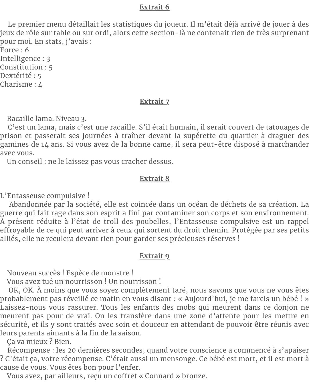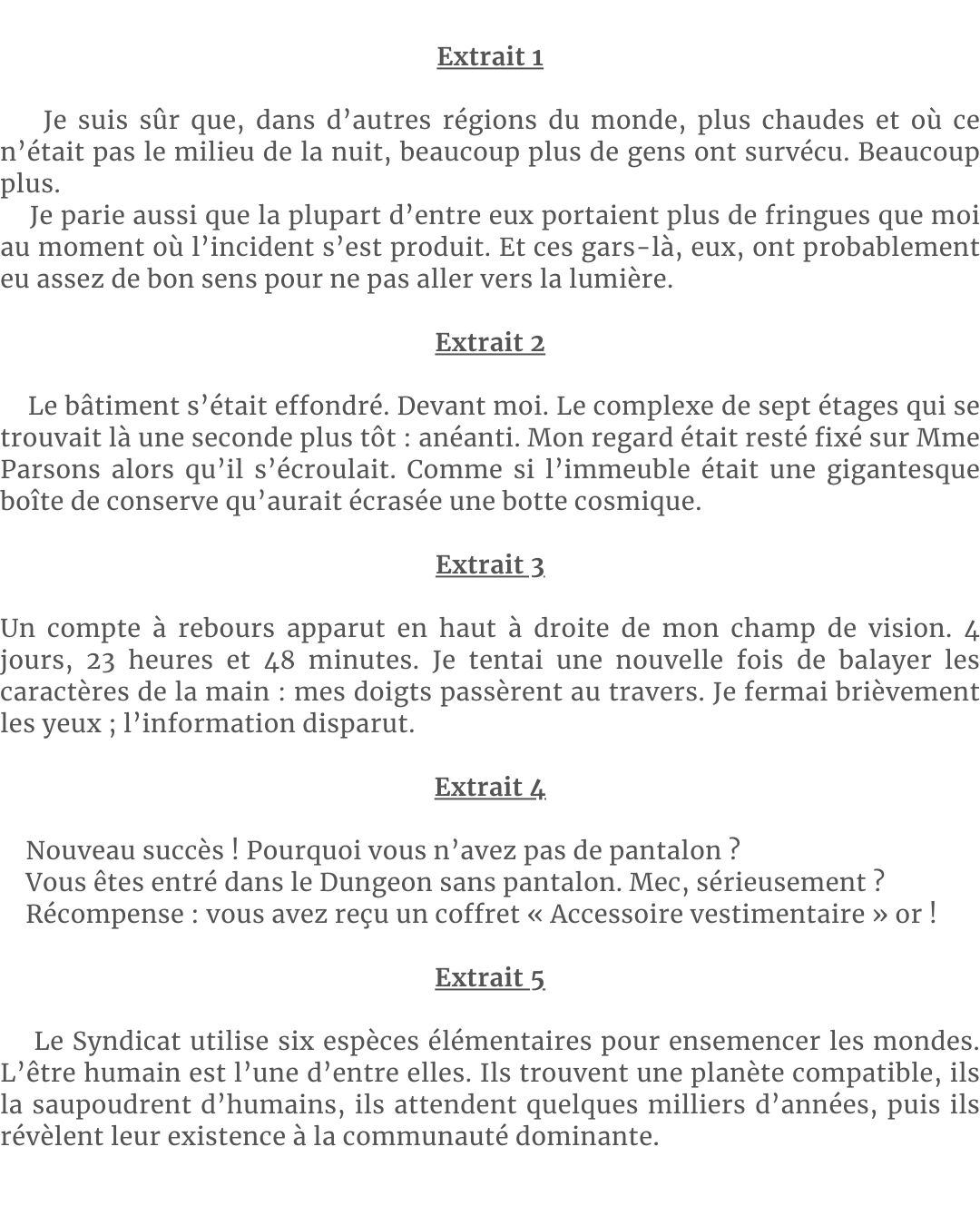Mordecai, le PNJ qui leur sert de guide pour le tutoriel, évoque 13 niveaux dans le donjon, mais il y en a certainement plus. Si ce roman est bien accueilli, sa vulgarité m’a complètement refroidie. Par ailleurs, les règles sont décousues. Créer un jeu de survie exige de donner les mêmes chances à tous les joueurs. Si des gens sont chez eux, ils meurent désintégrés, tandis que ceux qui vivent à l’opposé en plein jour survivent dehors… Absurde. Idem : Carl doit trouver par lui-même le tutoriel sans quoi il ne peut pas accéder à ses coffres ni monter de niveau. Tout est mis en place pour tuer sans sommation sans laisser la moindre chance, alors que c’est la base du livre.