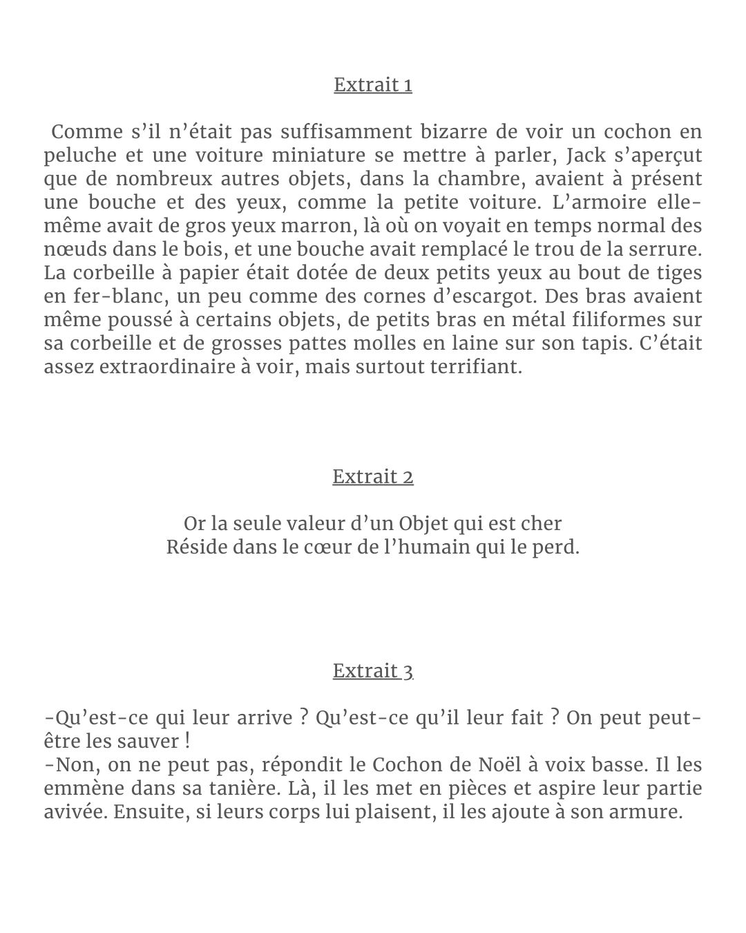 Auparavant très gentille, Holly va se montrer de plus en plus cassante avec le petit garçon, jusqu’à ce qu’au Réveillon, elle jette son doudou par la fenêtre de la voiture en marche… sur une autoroute… Un acte irréparable. Un nouveau cochon est acheté pour remplacer l’ancien, mais Jack est inconsolable, il veut retourner chercher LC. Alors que le soir tombe et qu’il s’apprête à partir, il entend des voix. Fébrile, il s’aperçoit que les objets de sa chambre sont vivants… Pas seulement les jouets, mais sa couette, son armoire, sa poubelle… Ils lui expliquent qu’il est possible de sauver LC, car en cette nuit de Noël, les miracles peuvent s’accomplir. Pour cela, Jack doit se rendre au Pays des Objets Perdus. C’est risqué, car Jack est un humain et si un Régulateur de Perte le découvre, il finira dévoré par le Grand Perdeur…