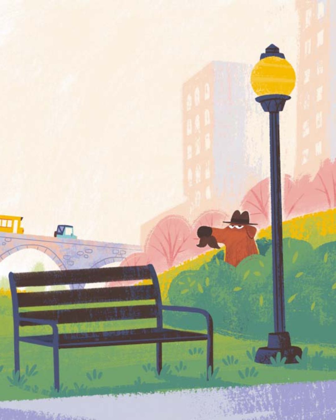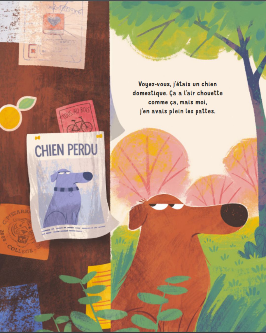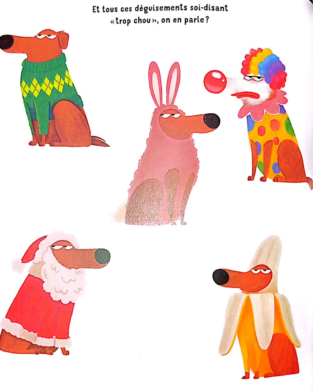 En grand format, J’adore ma vie de chien ! raconte l’histoire d’un toutou qui s’est enfui de chez lui. Dépité suite à toute la pression que son humaine lui impose, il décide de partir à l’aventure. L’histoire commence alors qu’il porte un fédora et une moustache, partiellement caché dans les buissons. Il explique ce qui l’a contrarié : être habillé de manière loufoque, porter une collerette (même s’il n’en comprend pas la nécessité), finir au régime à cause de son surpoids, être observé lors de ses besoins naturels…