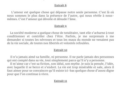 Par ailleurs, lorsque Jozef raconte sa vie à Alice Koënig, sa psychiatre, souvent des ellipses sont marquées lors des situations. On peut supposer que c’est pour conserver sa réelle vision de Camille, livrée à la toute fin. Mais, quand Jozef explique qu’ils se brouillent pour telle raison, rient de telle blague ; nous, en tant que lecteurs, souhaitons vivre la situation avec tous les détails. C’est ce qui rend un récit vivant. Par ailleurs, en s’adressant à Alice, il sait qu’elle ignore leur parcours et il doit fournir un maximum d’informations. On pourrait attribuer cette concision à l’état de Jozef, seulement, il se montre extrêmement prolixe dans son ressenti, sa place dans le monde, il décortique sa vieille âme honnêtement.