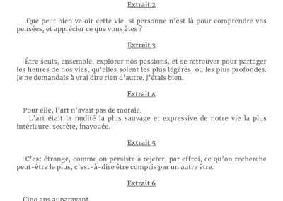 On pardonne les coquilles de ce récit au profit de la profondeur de ce voyage intérieur. Cette manière de dépeindre le monde avec beaucoup de justesse et d’authenticité, sans aucun faux-semblant ; cette amertume qui érode l’amour pur et beau. La plume est entière, ne se travestit jamais. On sent le talent de l’auteur qui a une véritable vocation dans l’écriture. Par ailleurs, ses dessins sont très sympathiques, notamment les décors avec les effets de lumière maîtrisés.