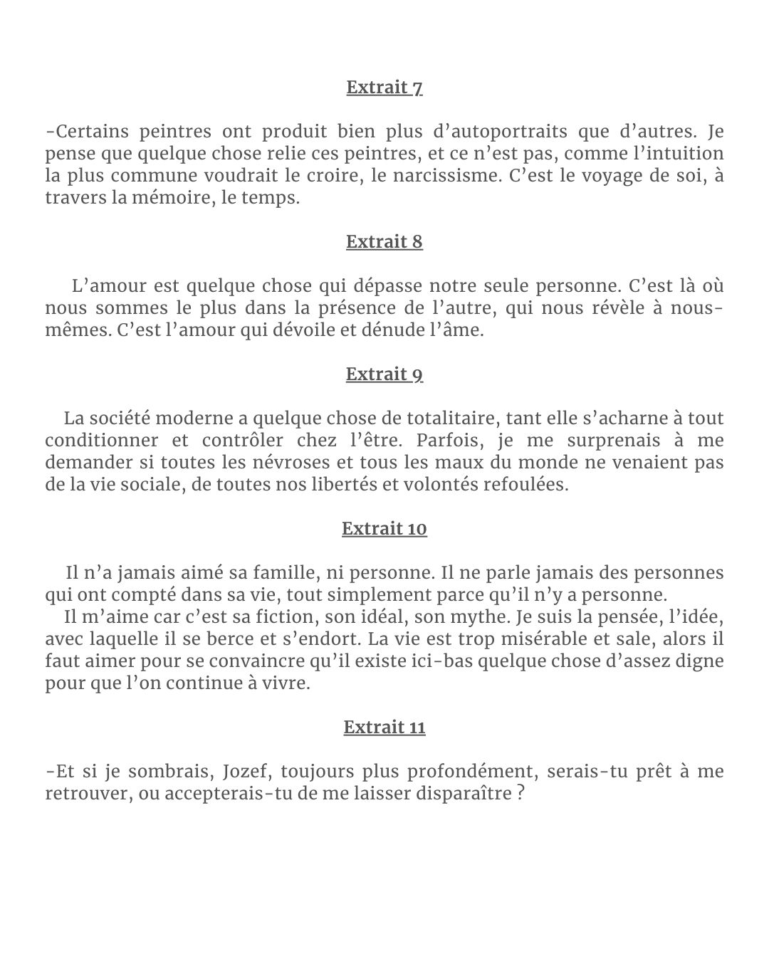 Par ailleurs, lorsque Jozef raconte sa vie à Alice Koënig, sa psychiatre, souvent des ellipses sont marquées lors des situations. On peut supposer que c’est pour conserver sa réelle vision de Camille, livrée à la toute fin. Mais, quand Jozef explique qu’ils se brouillent pour telle raison, rient de telle blague ; nous, en tant que lecteurs, souhaitons vivre la situation avec tous les détails. C’est ce qui rend un récit vivant. Par ailleurs, en s’adressant à Alice, il sait qu’elle ignore leur parcours et il doit fournir un maximum d’informations. On pourrait attribuer cette concision à l’état de Jozef, seulement, il se montre extrêmement prolixe dans son ressenti, sa place dans le monde, il décortique sa vieille âme honnêtement.