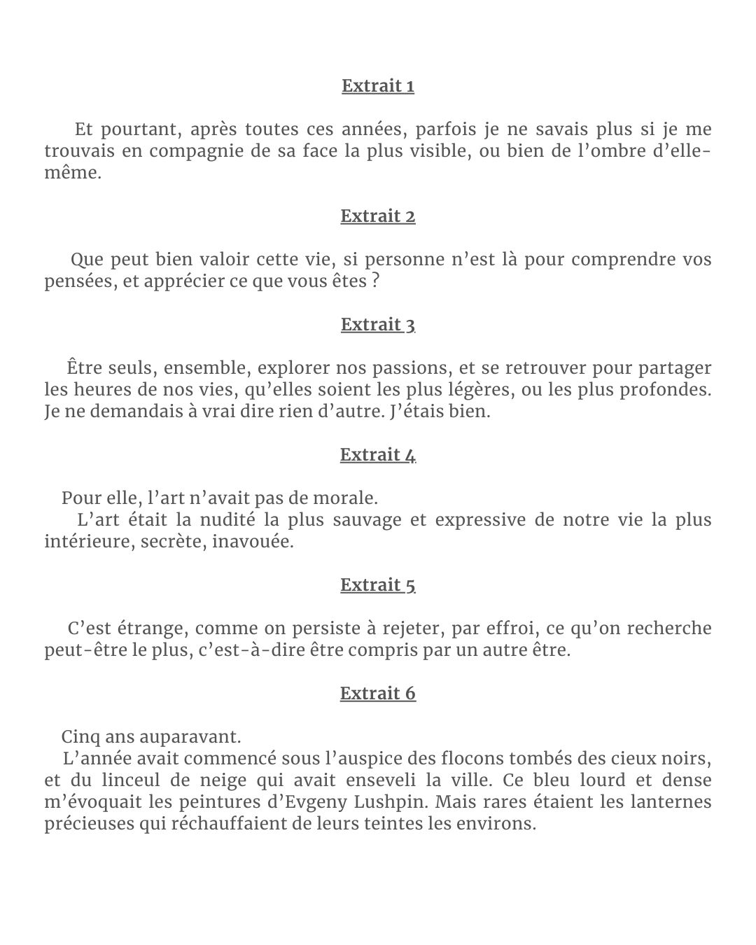 On pardonne les coquilles de ce récit au profit de la profondeur de ce voyage intérieur. Cette manière de dépeindre le monde avec beaucoup de justesse et d’authenticité, sans aucun faux-semblant ; cette amertume qui érode l’amour pur et beau. La plume est entière, ne se travestit jamais. On sent le talent de l’auteur qui a une véritable vocation dans l’écriture. Par ailleurs, ses dessins sont très sympathiques, notamment les décors avec les effets de lumière maîtrisés.