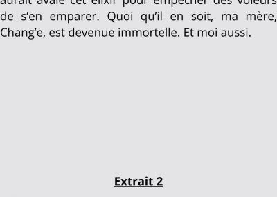 Chang’e est la Déesse de la Lune. Pour avoir dérobé l’Élixir d’Immortalité de son amant afin de permettre à sa fille, Xingyin, de survivre ; le Royaume Céleste l’a condamnée à vivre recluse sur la Lune pour l’éternité. Chang’e a donné naissance à Xingyin dans le plus grand secret sur l’astre luminescent. Et elle l’a protégée et muselant ses pouvoirs autant que possible afin de ne pas éveiller les soupçons.