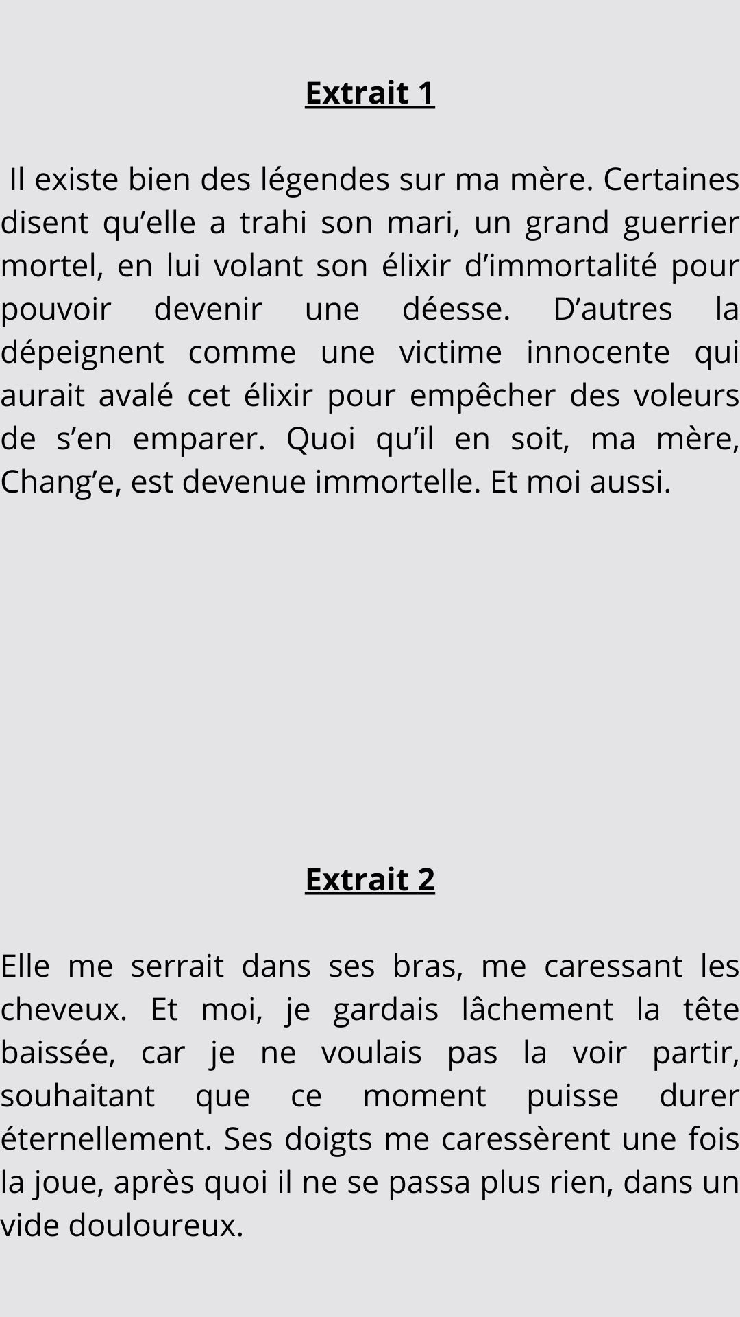 Chang’e est la Déesse de la Lune. Pour avoir dérobé l’Élixir d’Immortalité de son amant afin de permettre à sa fille, Xingyin, de survivre ; le Royaume Céleste l’a condamnée à vivre recluse sur la Lune pour l’éternité. Chang’e a donné naissance à Xingyin dans le plus grand secret sur l’astre luminescent. Et elle l’a protégée et muselant ses pouvoirs autant que possible afin de ne pas éveiller les soupçons.
