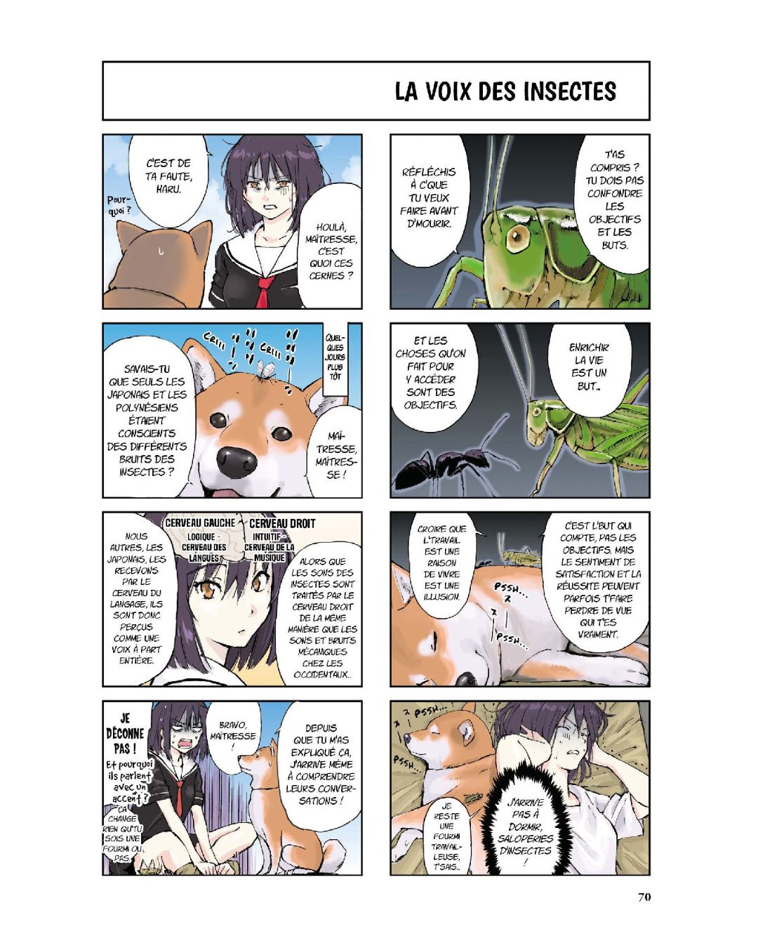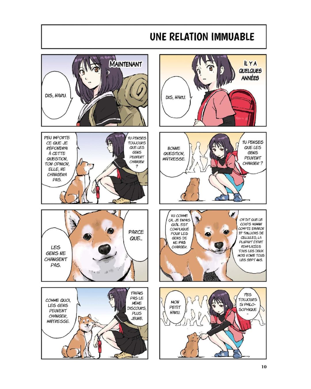 La fin du monde avec mon Shiba Inu raconte l’histoire de Haru et de sa maîtresse. L’auteure ne lui a pas donné de nom volontairement, pour mettre l’accent sur leur relation, la façon dont il la considère. Elle est sa maîtresse, point. Haru ne s’embarrasse pas avec d’autres appellations qu’il réserve à ses semblables. Elle, c’est sa maîtresse, au-delà de l’amitié et de l’amour, c’est une loyauté indéfectible qui est mise en avant.
