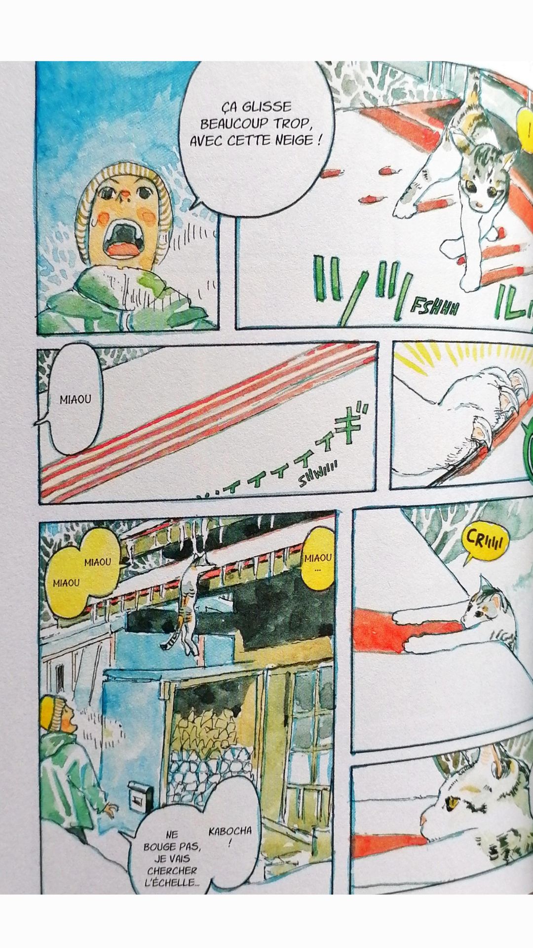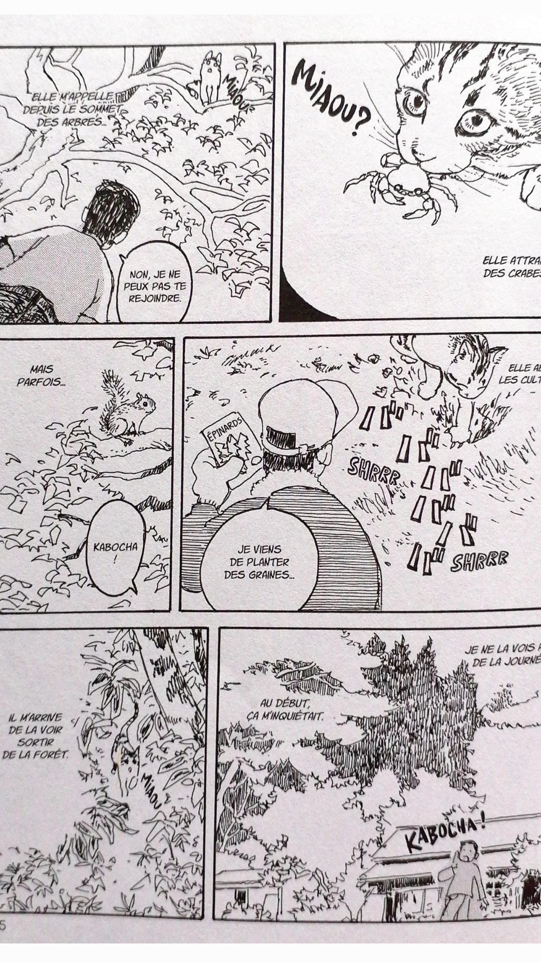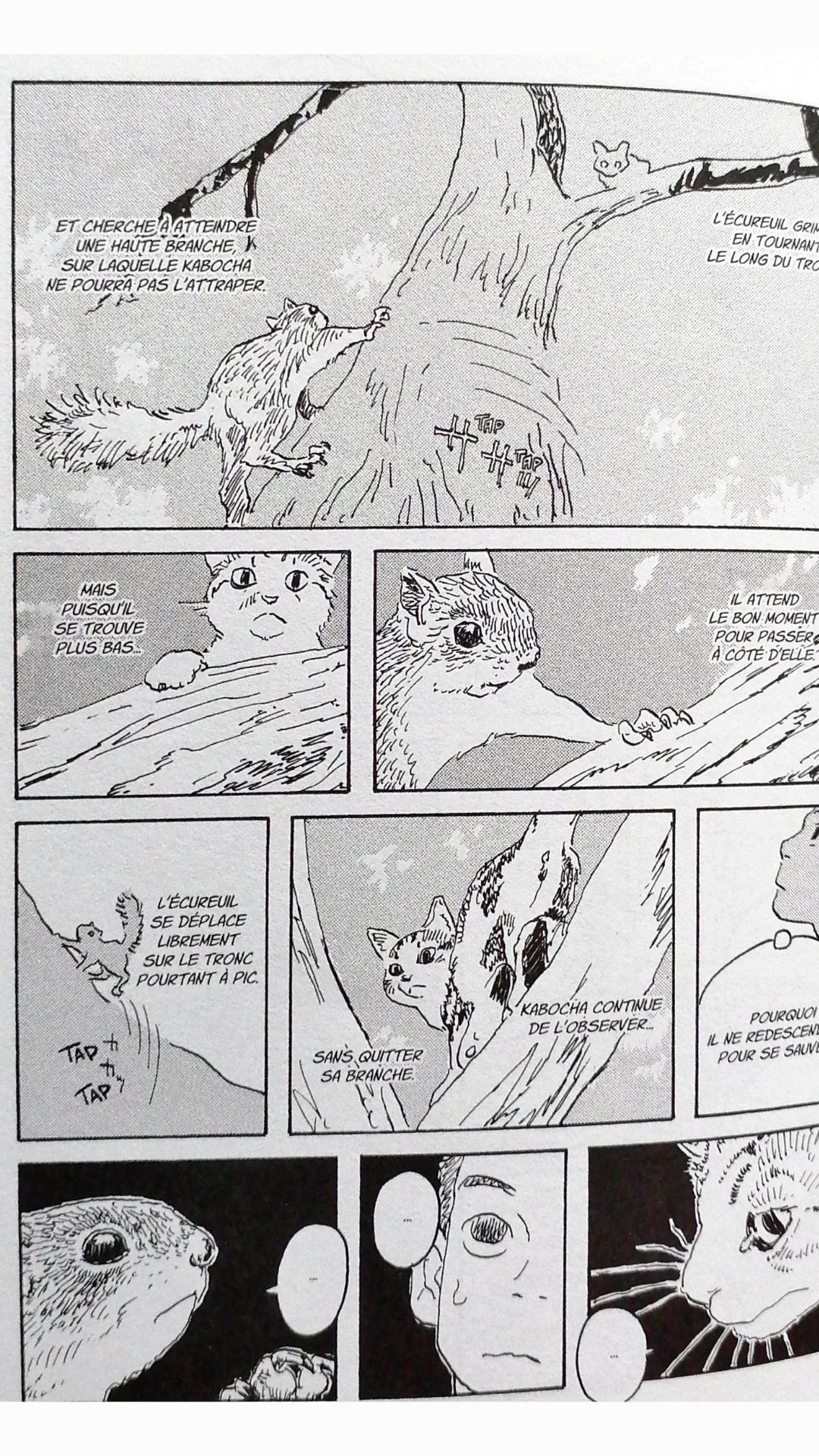 Les illustrations sont extrêmement réalistes, principalement celles des animaux. Tous les mouvements félins sont exacts ! La façon dont Kabocha s’étire, se toilette, saute pour jouer avec son humain, grimpe aux arbres… et même lorsqu’elle tombe !