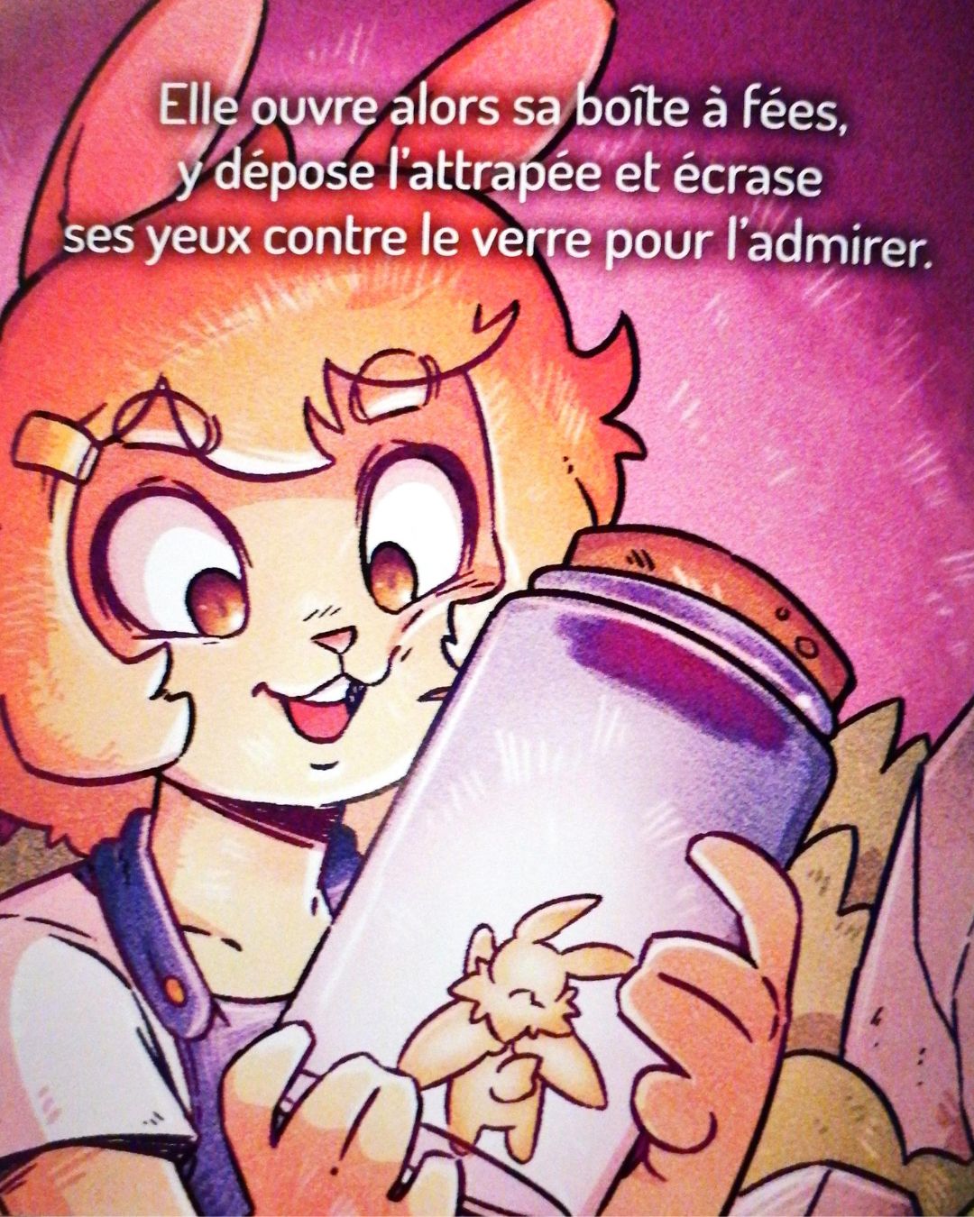 La petite lapine s’équipe de son filet pour attraper une luciole. Elle la pourchasse, tombe par terre en heurtant un gros caillou. La luciole s’arrête enfin, certainement fatiguée. Carotte en profite pour l’attraper et la déposer dans son bocal. La petite lapine réalise alors qu’elle a froissé une de ses ailes. Contrite, elle décide de réparer sa bêtise. La luciole lui indique une direction, Carotte se dirige vers sa maison en irradiant de lumière.