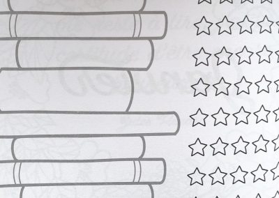 La Bibliothèque se compose d’une double page illustrée à compléter, soit environ cent titres à noter. Même principe pour la Wishlist, qui propose 56 livres plus larges pour écrire les titres à l’intérieur. Le Suivi de lecture est représenté sous la forme de 100 mini-livres à colorier une fois vos lectures terminées. Ça donne un aperçu clair du nombre de livres lus durant l’année. Une page Citations sert de modèle à droite, le pochoir contient justement une bulle à cette fin.