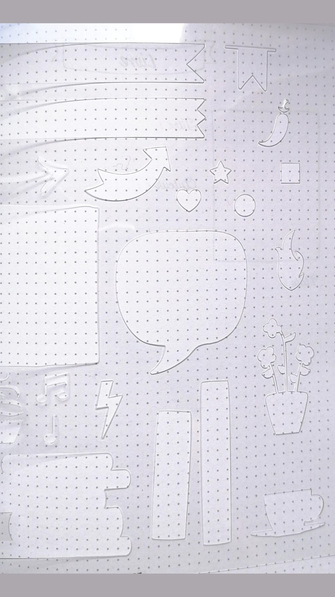 L’atout de ce cahier réside dans sa personnalisation. Le pochoir propose 22 motifs, dont le cadre qui sert de modèle pour la présentation de livre. Le pochoir inclut une règle de 19,7cm sur le côté droit. Le plastique est toutefois un peu trop souple, les motifs ont tendance à se décaler, notamment le pot de fleurs.