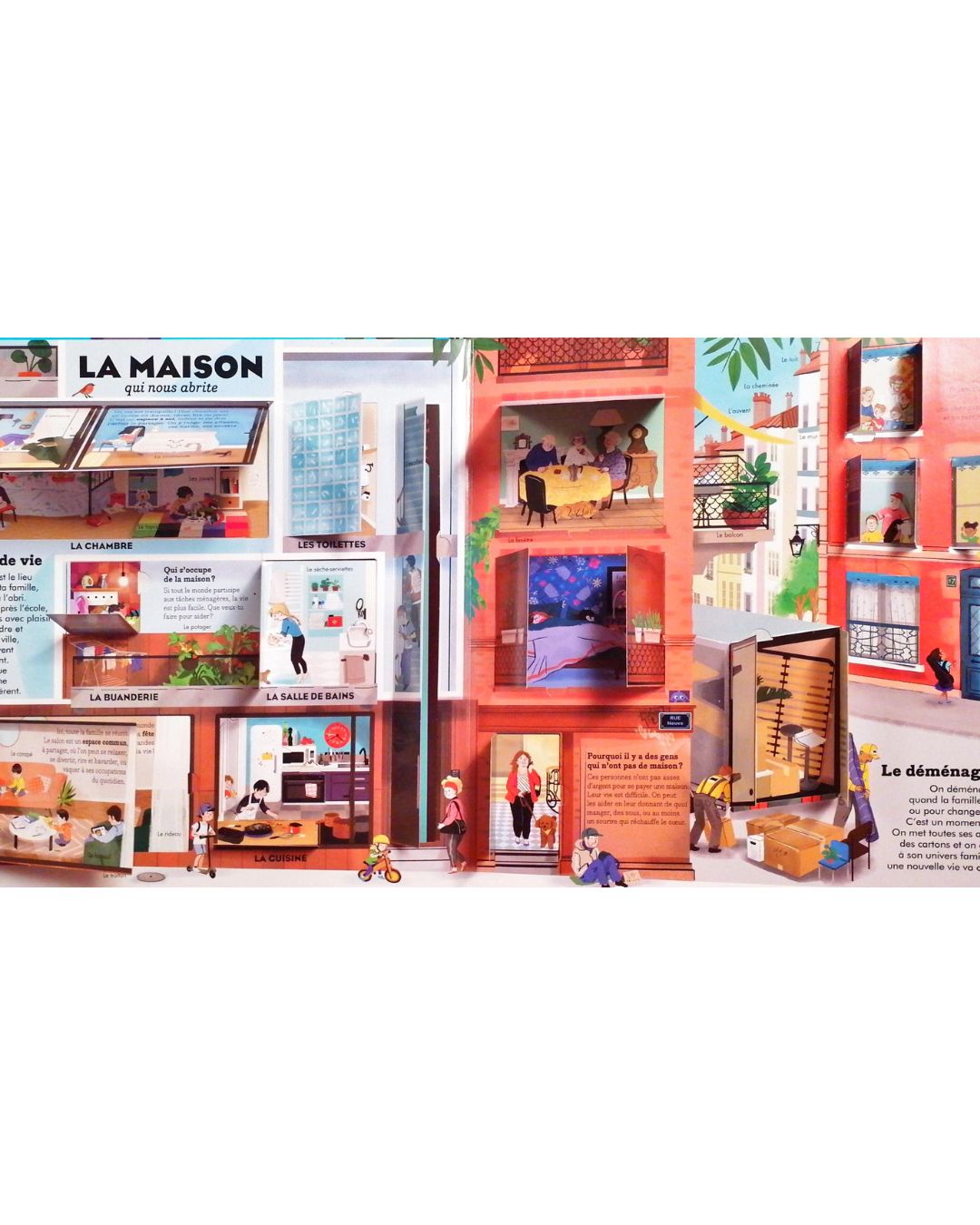 2 : La maison qui nous abrite. 9 rabats occupent la page de gauche. Qui s’occupe de la maison ? Présentation des diverses pièces de la maison. 9 rabats occupent la page de droite. C’est quoi en fait une famille ? Pourquoi il y a des gens qui n’ont pas de maison ? Le déménagement.