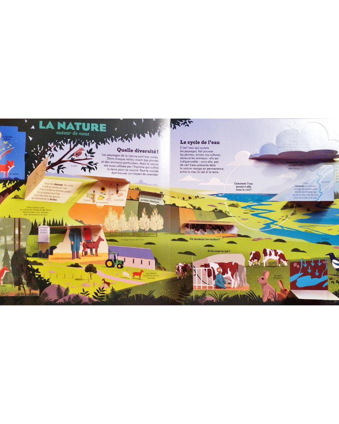 5 : La nature autour de nous. 7 rabats occupent la page de gauche. Quelle diversité ! La nature la nuit. Les animaux nocturnes. Où pousse le blé ? À quoi servent ces fleurs jaunes ? C’est quoi, les légumes bio ? Ça sert à quelque chose, les forêts ? Qui habite la ferme ? 6 rabats occupent la page de droite. Le cycle de l’eau Comment l’eau monte-t-elle dans le ciel ? Comment l’eau tombe-t-elle des nuages ? Comment l’eau coule-t-elle sur la Terre ? Où dorment les vaches ? D’où vient le lait ? Comment l’eau coule-t-elle dans la Terre ?
