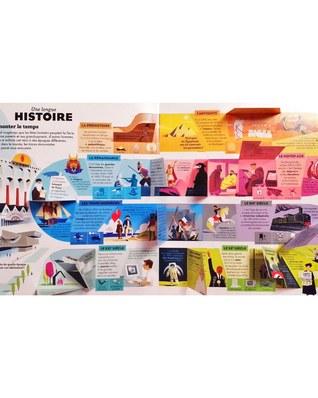 12 : Une longue histoire. La frise se déploie sur la double page. 9 rabats occupent la page de gauche. 8 rabats occupent la page de droite. Remonter le temps. Sais-tu de quelle époque datent ces bâtiments ? La Préhistoire. Quand commence le néolithique ? L’Antiquité. Pourquoi les Égyptiens ont-ils construit les pyramides ? Qu’ont inventé les Grecs et les Romains ? Le Moyen-Âge. Comment est organisée la société féodale ? Voyageait-on au Moyen-Âge ? La Renaissance. Qui sont les conquistadors ? Quel grand artiste accueille-t-il ? Les Temps Modernes. Connais-tu les philosophes des Lumières ? Le XIXème siècle. Qui travaille dans les usines ? Le XXème siècle. Qu’est-ce que le nazisme ? Qui va redonner espoir au monde ? Le XXIème siècle. Quels défis pour demain ?