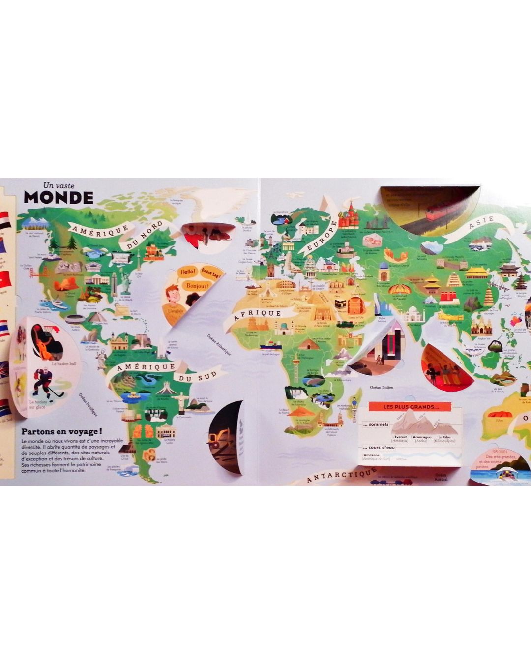 11 : Un vaste monde. La double page incorpore une carte du monde. 5 rabats occupent la page de gauche. Cherche et trouve. Drapeaux du monde. Quels sont les sports d’équipe les plus populaires aux États-Unis ? Partons en voyage ! La banquise est-elle habitée ? Quelles sont les trois langues les plus parlées en Europe ? Pourquoi l’Amazonie est-elle précieuse ? 6 rabats occupent la page de droite. Qu’est-ce que le Transsibérien ? Y a-t-il des gens qui vivent dans le désert ? C’est quoi, Bollywood ? Quelle est la particularité de Tokyo ? Le monde en chiffres. Les plus grands… Il y a combien d’îles en Océanie ?