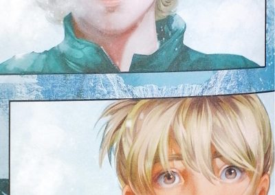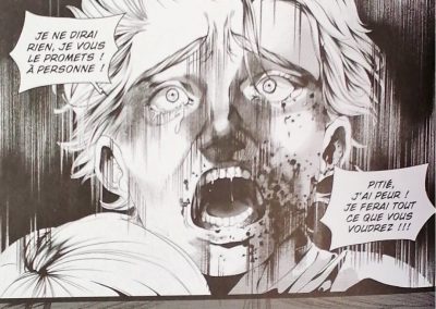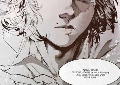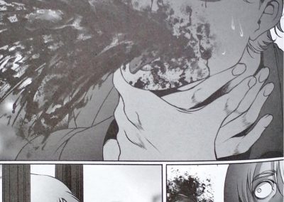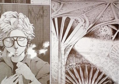 On ressent dans Moody Rouge l’influence de Monster, que l’auteure a découvert très tôt, ainsi que les œuvres de Dario Argento, une éminence du giallo. Ce genre si particulier entremêle enquête, érotisme et horreur ; sublimé ici d’une patte graphique parfaitement maîtrisée. Ben, sur la couverture, fait penser à Johan Liebert. La passion de l’auteure pour l’art se distingue nettement : les planches sont de toute beauté, notamment 7 pages couleur dans le récit. Le trait, et particulièrement les visages, est magnifique, un travail d’orfèvre.