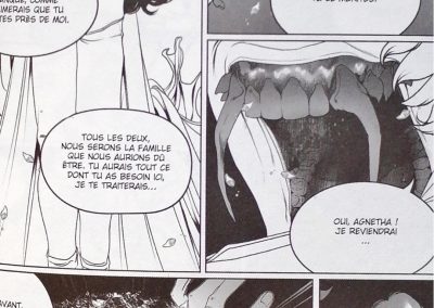Concernant le scénario, on embarque très vite dedans en se demandant où ça mène. Toutefois, s’il y a des idées intéressantes, de nombreux points restent malheureusement obscurs. Que sont Ben, Agnetha et leur père au final ? Qui est leur mère ? Pourquoi Agnetha a légué un rein à son frère ? Pourquoi l’extraction des dents dans les années 70 (qui apparaissent ordinaires contrairement au plan dans l’enfance) ne l’empêche pas de disposer de dents pointues dans la suite du scénario ? Pourquoi cette protubérance à la suture ? Pourquoi Ilya avait déjà le blanc de l’œil droit rougi ? Était-il spécial avant sa rencontre avec Agnetha ? Comment a-t-il recouvré ses forces après sa dernière rencontre avec Adrian ? Beaucoup de questions demeurent sans réponses. La narration est quelque peu maladroite, ce qui perd parfois le lecteur dans la temporalité et la propre réalité des protagonistes. Une confusion qui dessert le récit, pourtant riche, à l’atmosphère macabre impactant. On perçoit une certaine poésie, juchée dans les entrailles de ce petit monde. J’aime tout particulièrement la poésie macabre qui entremêle horreur et beauté. Nul doute que les prochaines parutions d’Ariane Astier seront d’autant plus savoureuses.