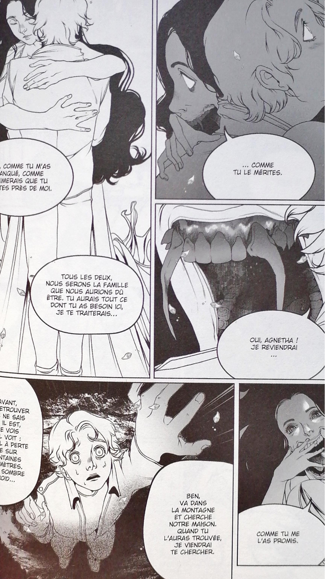 Concernant le scénario, on embarque très vite dedans en se demandant où ça mène. Toutefois, s’il y a des idées intéressantes, de nombreux points restent malheureusement obscurs. Que sont Ben, Agnetha et leur père au final ? Qui est leur mère ? Pourquoi Agnetha a légué un rein à son frère ? Pourquoi l’extraction des dents dans les années 70 (qui apparaissent ordinaires contrairement au plan dans l’enfance) ne l’empêche pas de disposer de dents pointues dans la suite du scénario ? Pourquoi cette protubérance à la suture ? Pourquoi Ilya avait déjà le blanc de l’œil droit rougi ? Était-il spécial avant sa rencontre avec Agnetha ? Comment a-t-il recouvré ses forces après sa dernière rencontre avec Adrian ? Beaucoup de questions demeurent sans réponses. La narration est quelque peu maladroite, ce qui perd parfois le lecteur dans la temporalité et la propre réalité des protagonistes. Une confusion qui dessert le récit, pourtant riche, à l’atmosphère macabre impactant. On perçoit une certaine poésie, juchée dans les entrailles de ce petit monde. J’aime tout particulièrement la poésie macabre qui entremêle horreur et beauté. Nul doute que les prochaines parutions d’Ariane Astier seront d’autant plus savoureuses.