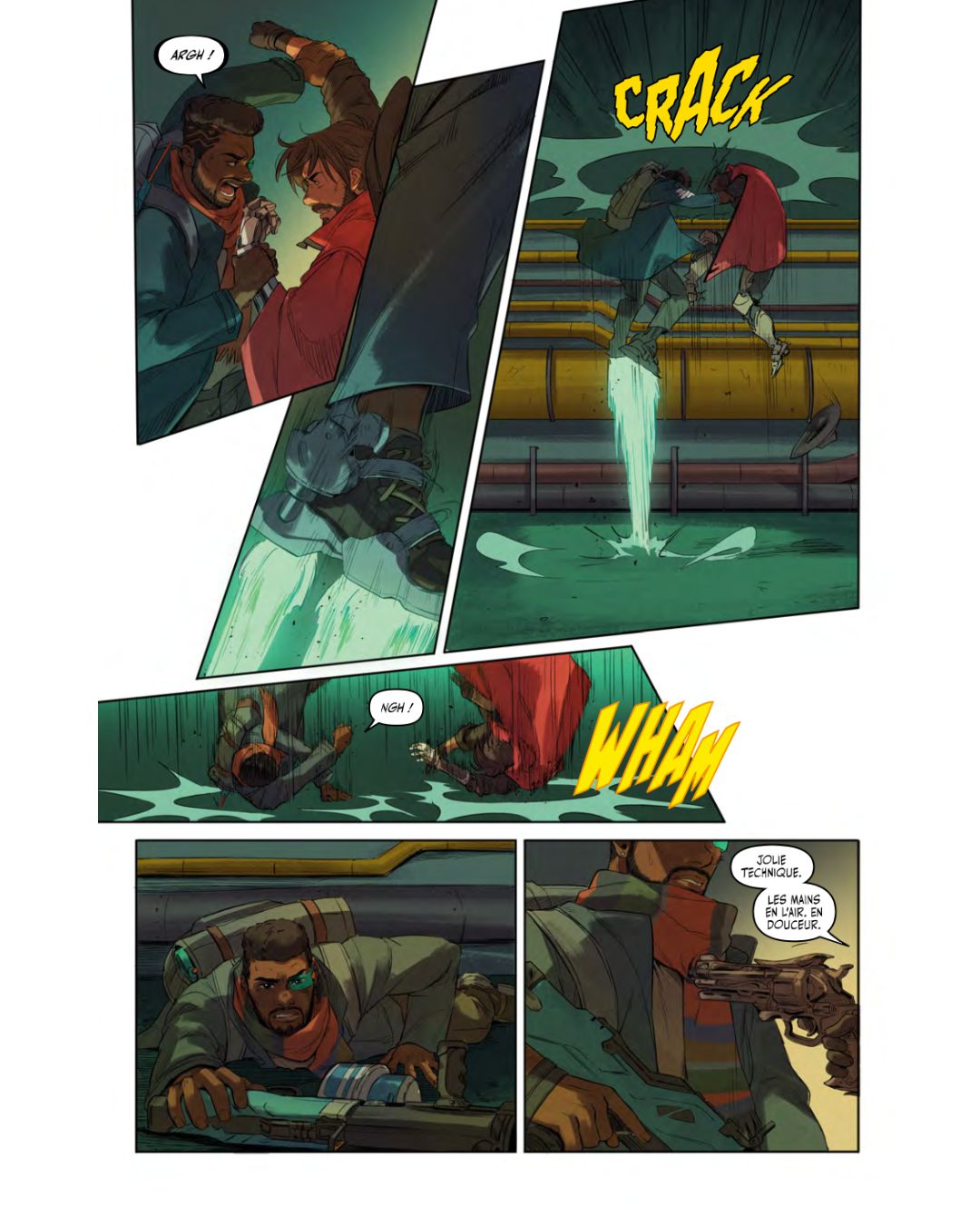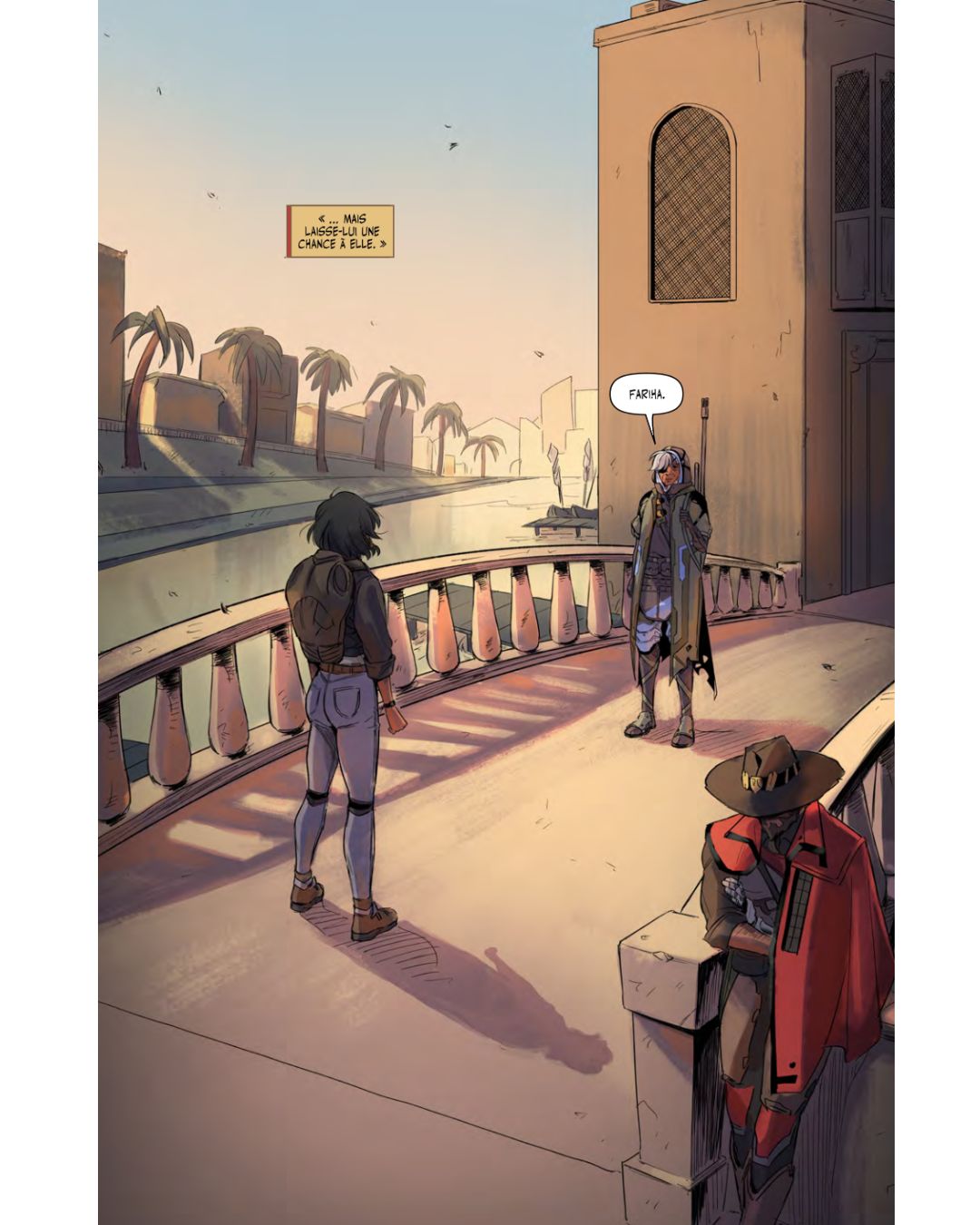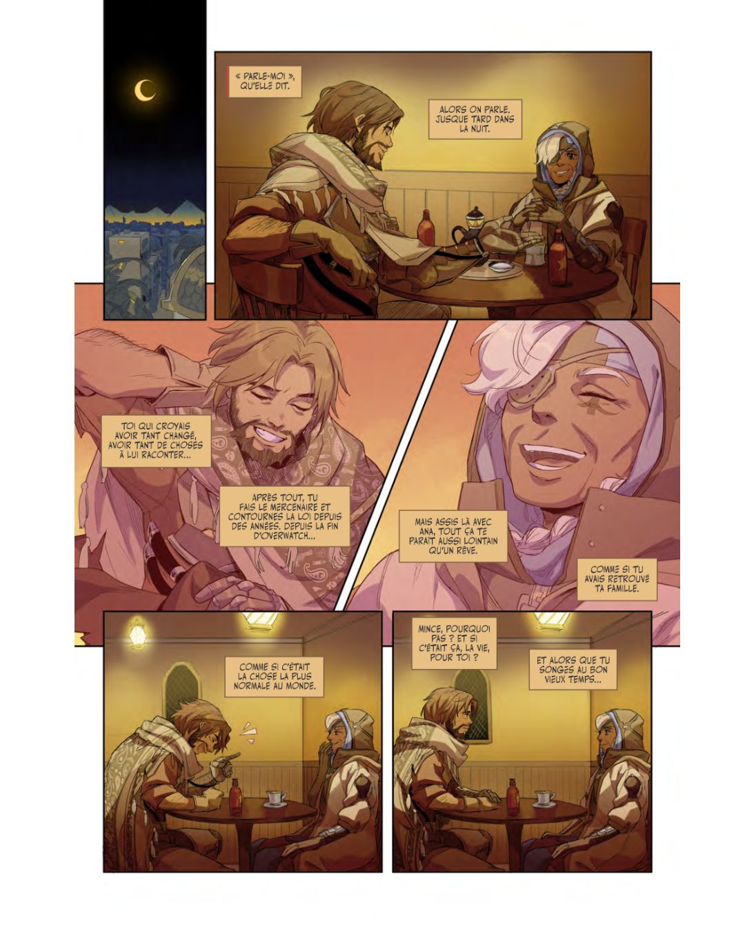 Le second volume se focalise sur le personnage de Pharah, toujours au Caire. Ana enjoint Cassidy de tout faire pour la recruter au sein d’Overwatch. Vous découvrez donc l’héroïne au sein de sa compagnie, le Helix, qu’elle a fondée afin de rendre la ville sûre et sécurisée, d’en faire un havre de paix. Un premier choix intéressant et logique, d’autant qu’il permet de se concentrer sur le background de cette dernière tout en étoffant celui d’Ana (sa mère, pour ceux qui l’ignorent). Au cours de ces quelques 20 pages particulièrement scénarisées avec soin, vous allez en apprendre plus. Excessivement bien écrit, ce dernier parvient sans peine à étayer la relation entre les deux, leurs inimitiés et ressentiments, remords et regrets. En résulte une histoire particulièrement touchante et vraiment agréable à lire, sans doute l’un des meilleurs de cette série, mais qui aurait clairement mérité un développement plus important au sein d’un tome conséquent.