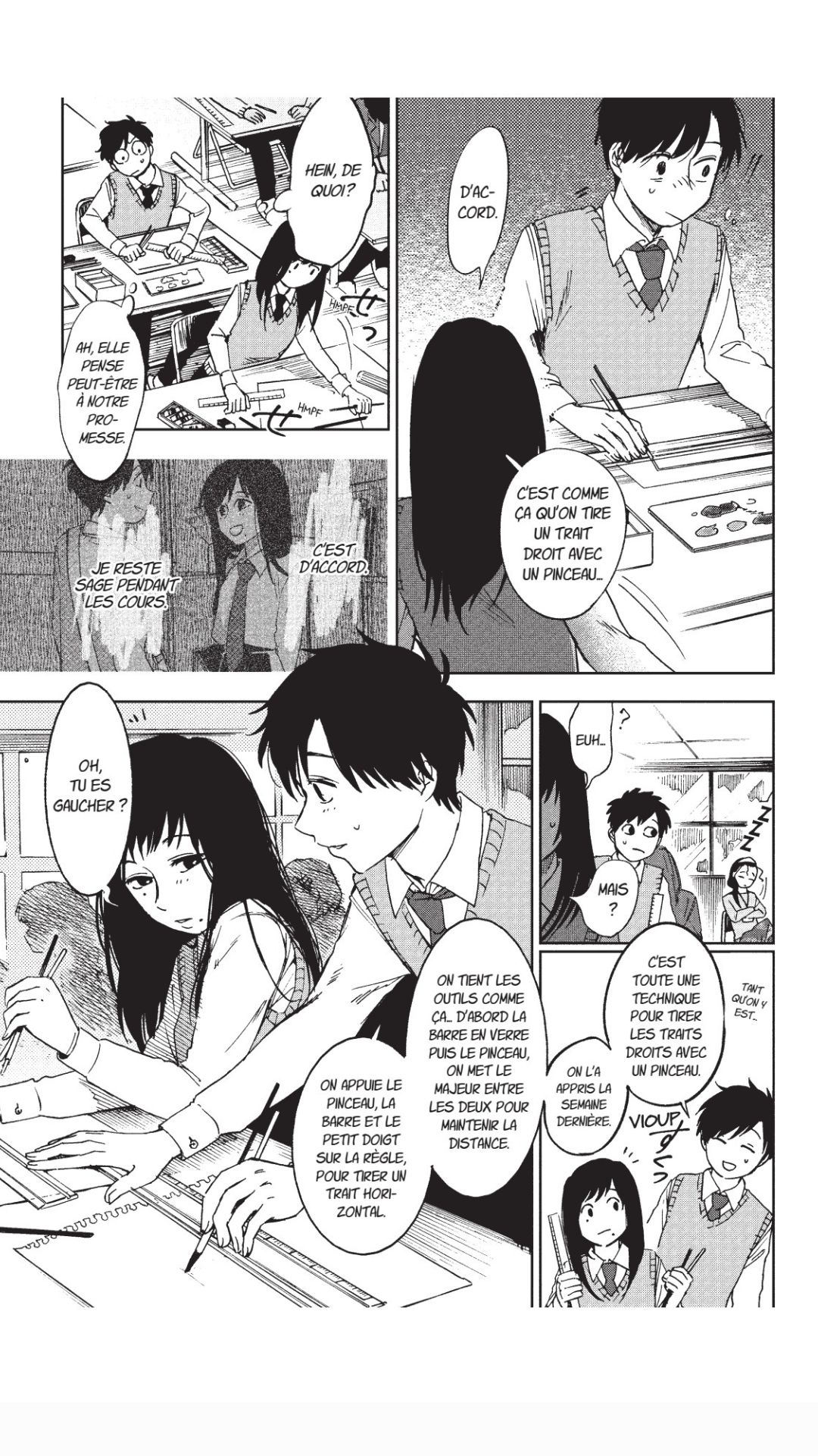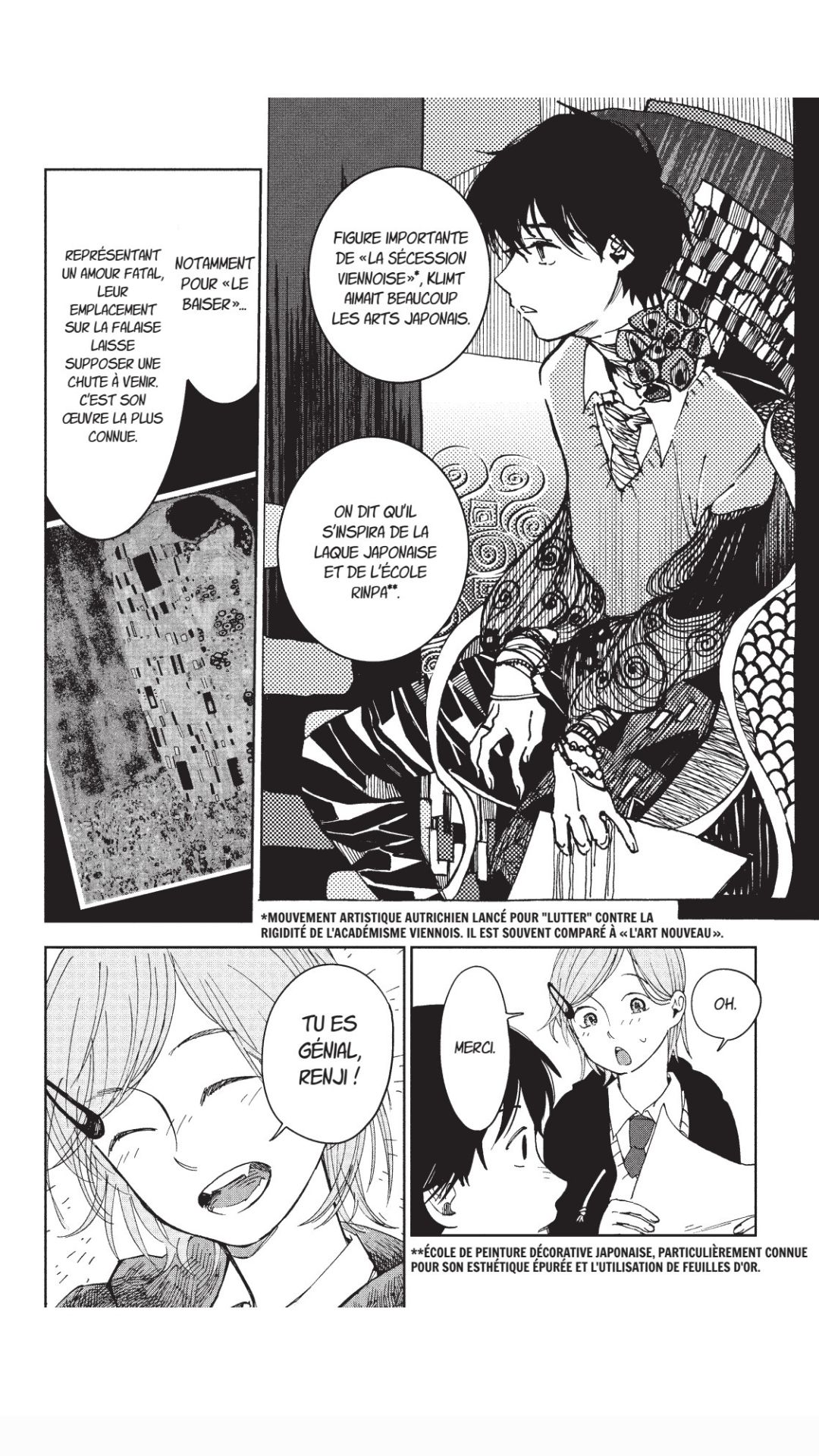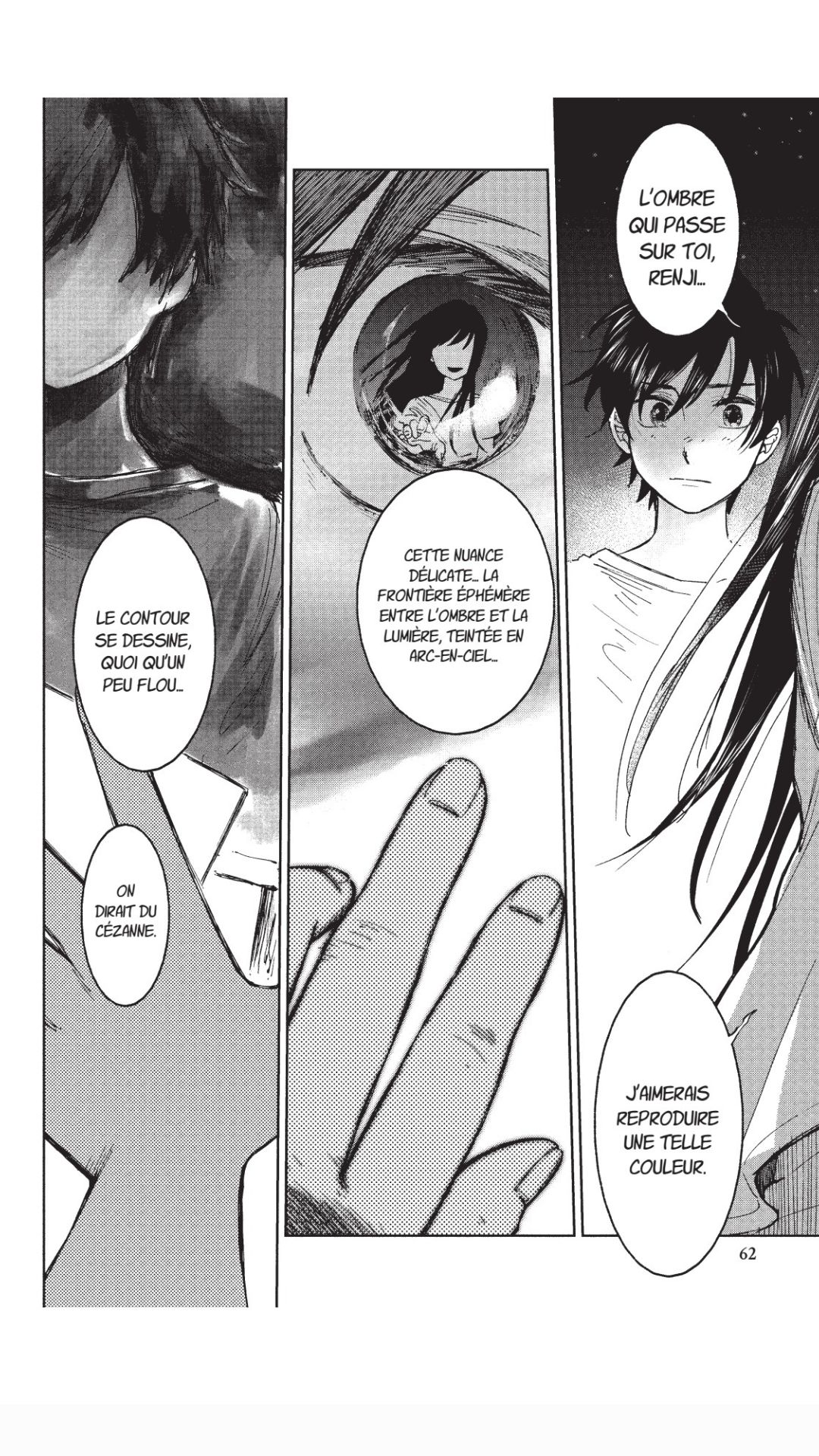 Le format de 2 volumes s’avère beaucoup trop court pour cette histoire qui aurait mérité des éclaircissements. Pour commencer, le temps s’écoule beaucoup trop vite, les saisons défilent sans réelle transition. Si ce problème se pose également dans Blue Period, on peut l’imputer sur l’acharnement de Yatora qui crée par passion, en perdant la notion du temps. Ici, Renji est rangé, il accomplit son travail sans réel effort ni passion. Et c’est celle de Naomi qui lui donne envie de découvrir la sienne. Alors Renji cherche sa propre identité artistique, au-delà de la technique.
