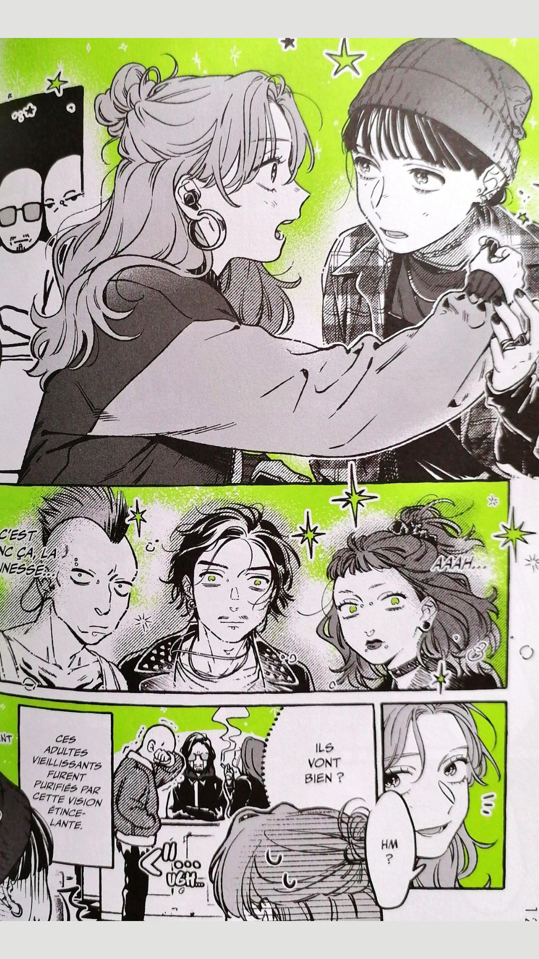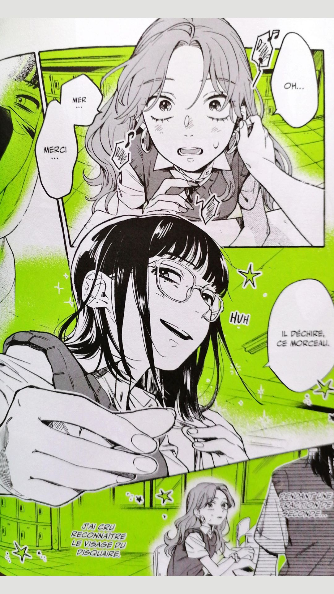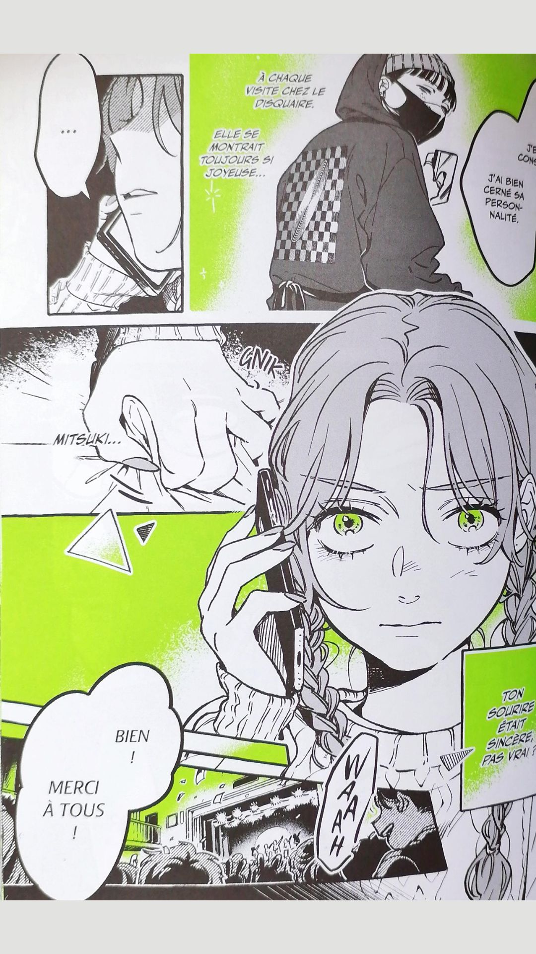 La romance entre Aya et Mitsuki attendrit forcément. Au-delà de sa timidité, j’ai aimé cette audace dont elle peut faire preuve. Et Aya prouve que ce ne n’est pas une fille superficielle, elle n’écoute pas les mêmes musiques que ses amies, elle a les siennes qui affirment ses propres goûts, issus d’une autre époque pour la majorité.