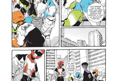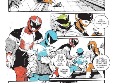 Mathieu Bablet, à l’écriture, ne cherche ni à émouvoir gratuitement, ni à rejouer les codes du genre pour mieux les parodier. Il démonte, décortique, puis reconstruit le mythe sentai avec une mélancolie tranchante. Chaque flashback agit comme une gifle chromatique : couleurs saturées, poses grandiloquentes, slogans hurlés dans le vide, compositions symétriques d’une précision quasi militaire… C’est un théâtre de lumière et de bruit, figé dans une forme de perfection grotesque, comme un générique de dessin animé trop bien remastérisé pour son propre bien.