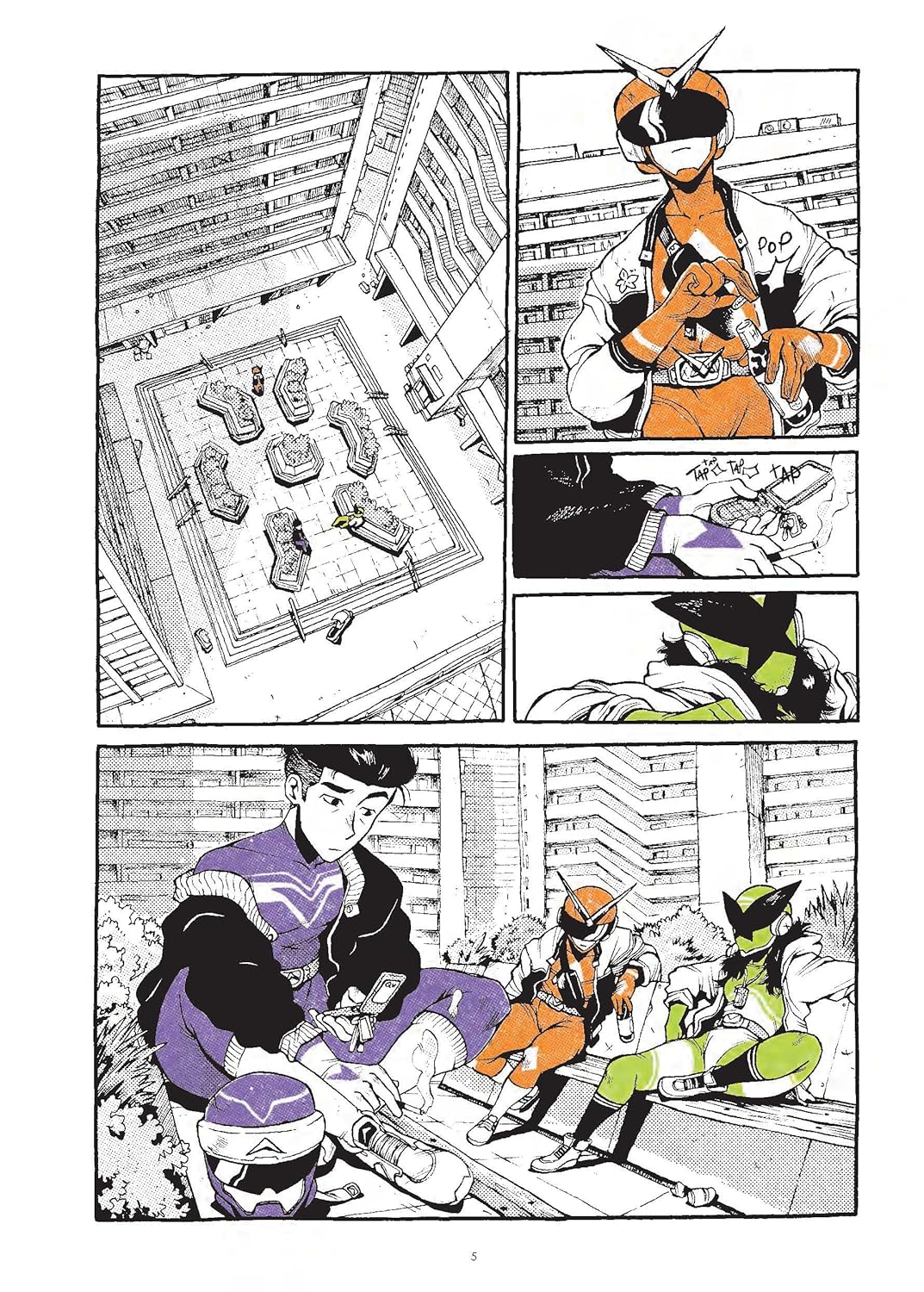 Les séquences de flashback sont des éclats de pure iconographie sentai. Costumes exubérants, angles dynamiques, poses dramatiques, explosions stylisées, combats en pleine verticalité. Les corps sont des flèches, les bras pointent vers le ciel comme pour conjurer l’oubli. Tout est exagéré, glorifié, presque baroque, comme si l’âge d’or des Sentai avait été tourné sur pellicule 35 mm avant d’être rembobiné à l’infini. Les couleurs (ou plutôt leurs souvenirs) y transpercent la page : même en noir et blanc, on sent la lumière des néons, la chaleur du feu, le rouge trop rouge des casques d’autrefois.