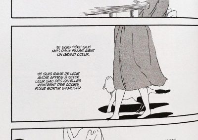 Le style de dessin est minimaliste, aérien ; un trait sobre qui met l’accent sur les dialogues et l’introspection de Chiharu. Ses états d’âme profonds ponctuent ce manga, toujours intégrés avec justesse. Il y a ce que Chiharu accomplit au quotidien et ce qu’elle pense réellement, dans un silence absolu. Elle prend son indépendance dans des actes simples pour commencer : marcher pieds nus sous la pluie. Elle pourrait passer pour une folle, mais brise justement cette convention de cette façon. Petit à petit, elle grignote la muselière qui la retient prisonnière. Son travail à mi-temps dure 2 ans. Hélas, les réunions scolaires, les absences pour veiller ses filles malades, etc ; incitent son patron à la licencier. Chiharu s’y attendait et le prend bien ; après avoir épargné cette jolie somme, elle retourne à ses pénates, jusqu’à ce que ses filles décident de rentrer dans un club de volley qui va exiger tout leur temps, y compris leur Dimanche…