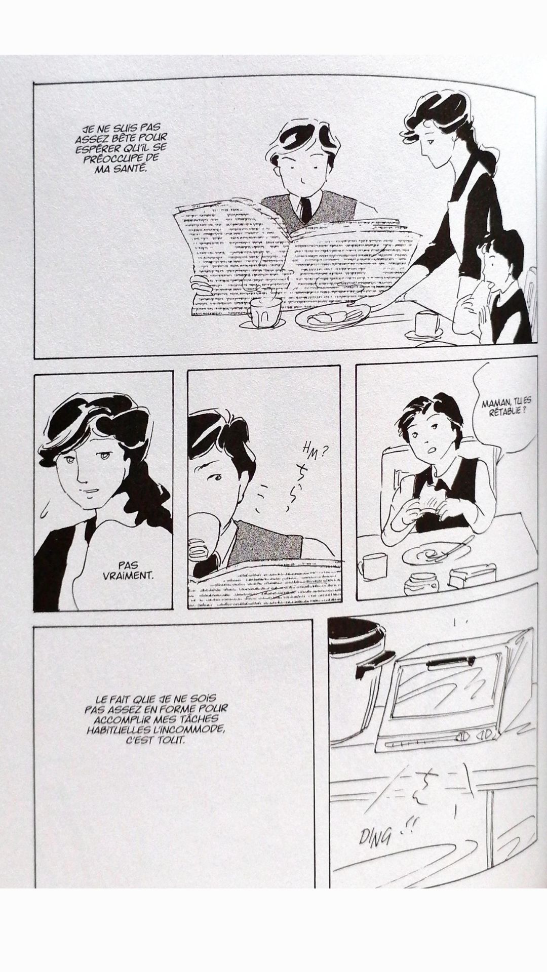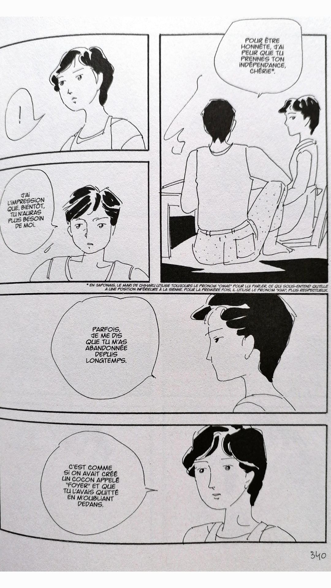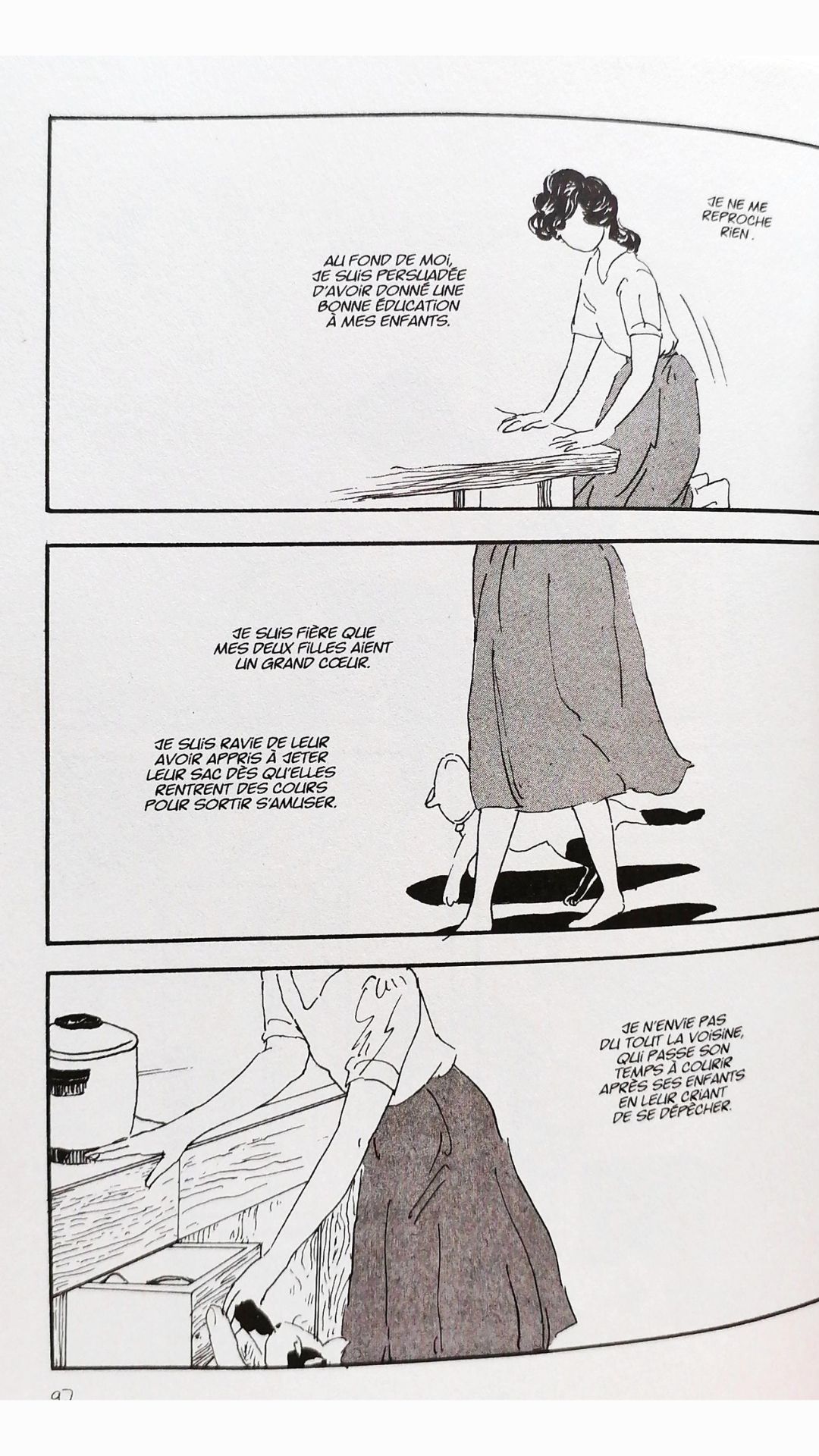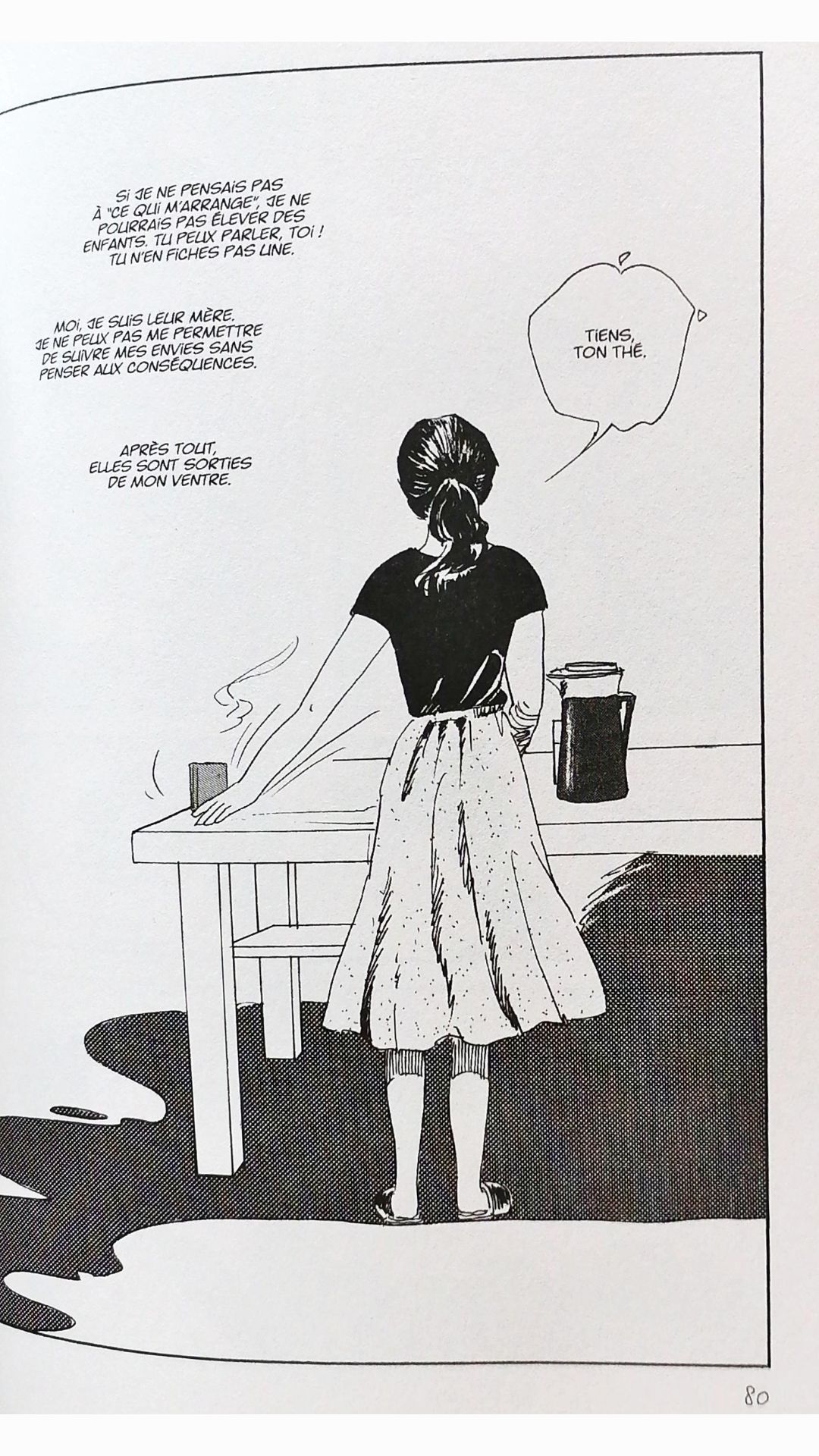 Ces 384 pages témoignent de l’évolution de Chiharu, davantage de rébellion que l’on sent croître au fil du temps. Lorsqu’elle est malade, cela contrarie son époux qui exige toujours autant, alors elle songe : « Vivement qu’il parte travailler. Je veux me reposer. » Parfois elle rêvasse, trouver l’amour autre part, se libérer de cette situation qui la plonge dans une solitude tellement intense… Mais Chiharu ne fléchit jamais, car c’est une femme extrêmement loyale et surtout impliquée dans son rôle de mère.
