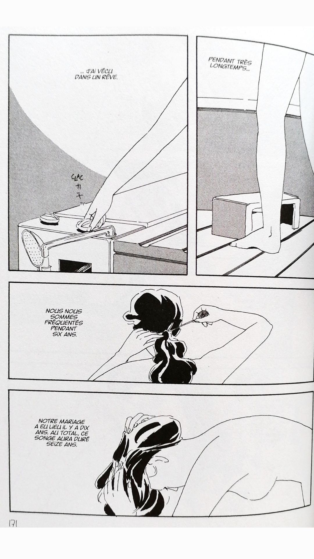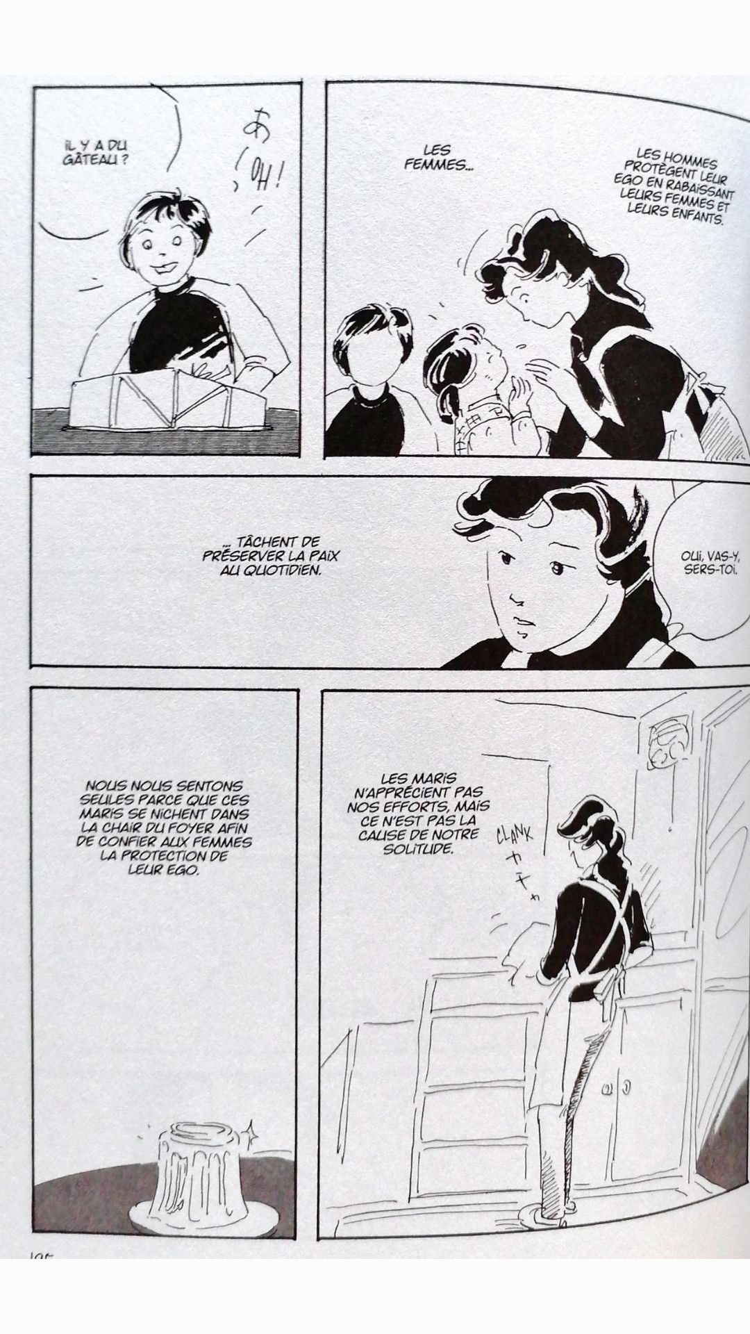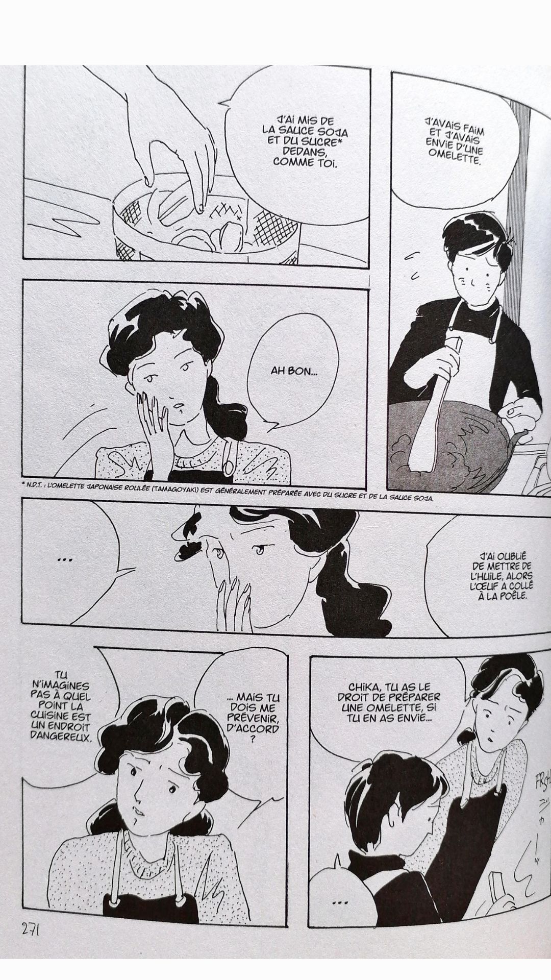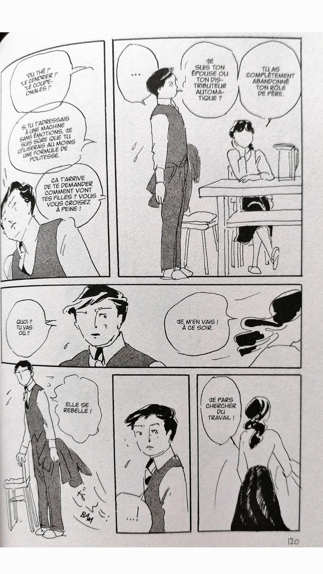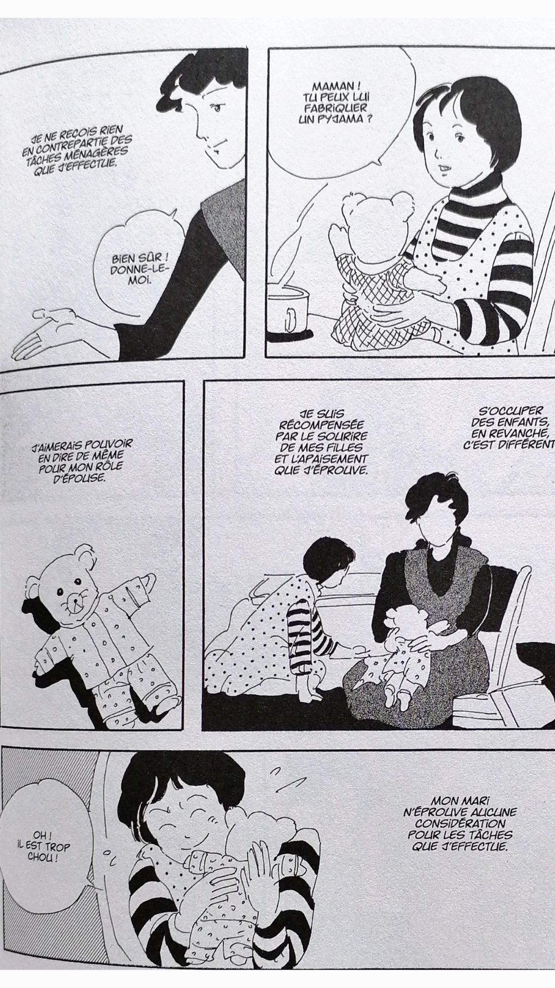 Ces 384 pages témoignent de l’évolution de Chiharu, davantage de rébellion que l’on sent croître au fil du temps. Lorsqu’elle est malade, cela contrarie son époux qui exige toujours autant, alors elle songe : « Vivement qu’il parte travailler. Je veux me reposer. » Parfois elle rêvasse, trouver l’amour autre part, se libérer de cette situation qui la plonge dans une solitude tellement intense… Mais Chiharu ne fléchit jamais, car c’est une femme extrêmement loyale et surtout impliquée dans son rôle de mère.