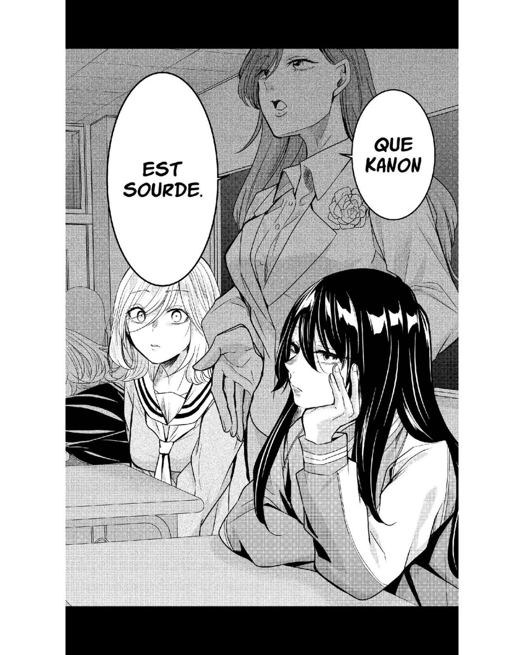Par la suite, Kanon intègre la classe de Saki. La jeune lycéenne découvre que Kanon est sourde, c’est pour ça qu’elle n’avait pas réagi lorsque Saki lui avait parlé le soir de l’incident. Saki essaie de se rapprocher d’elle, mais Kanon refuse tout contact avec les autres. Elle préfère rester dans sa bulle. Par ailleurs, ayant subi du harcèlement scolaire, ça ne l’aide pas à accorder sa confiance.