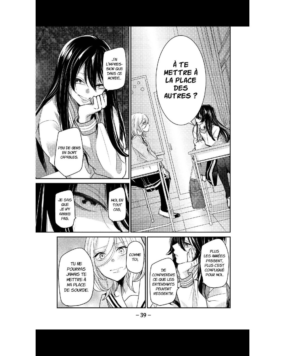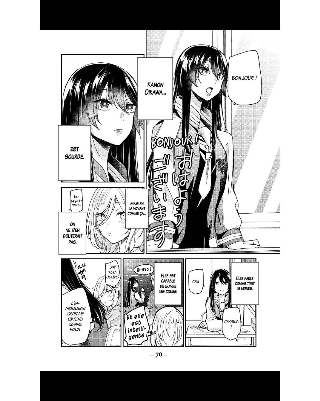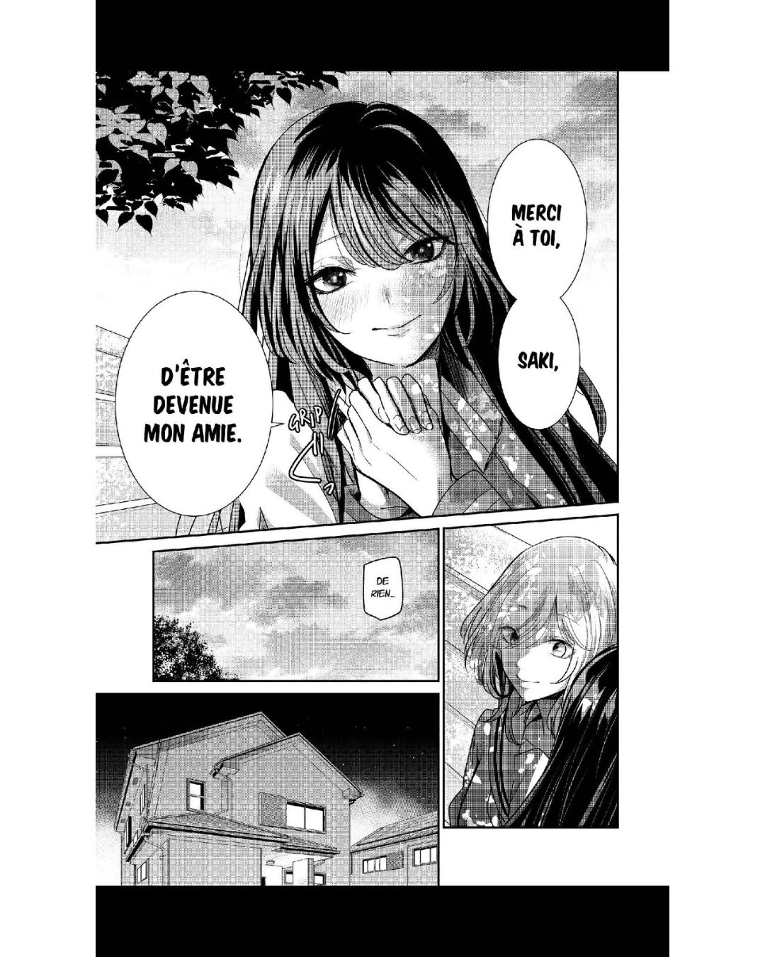 Je trouve la relation de Saki et Kanon très mignonne. On s’attache à elles. Saki essaie de tout faire pour intégrer le monde de Kanon et n’hésite pas à apprendre la langue des signes pour y arriver. On sent que l’affection qu’elle lui destine dépasse l’amitié, notamment à la dernière page, quand Saki forme le mot mariage en désignant deux femmes avec ses mains. Kanon est plus nuancée, mais il est clair que Saki compte énormément pour elle, comme lorsqu’elle dit « Je n’ai pas besoin d’amis, je t’ai toi. » Une déclaration très claire qui fait rougir Saki.