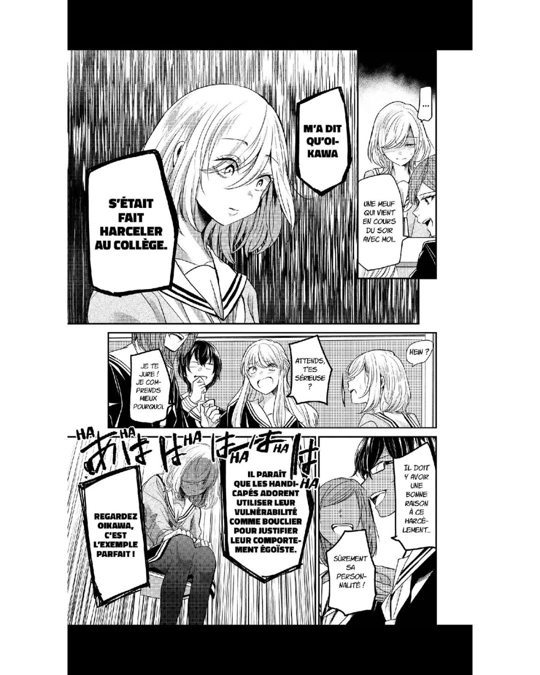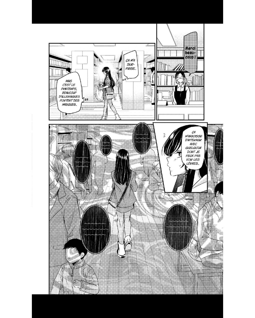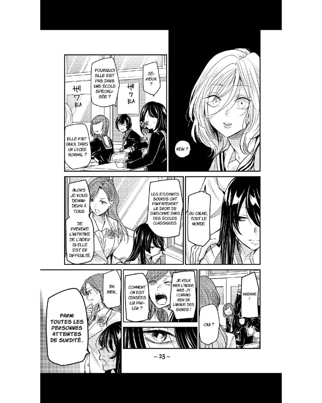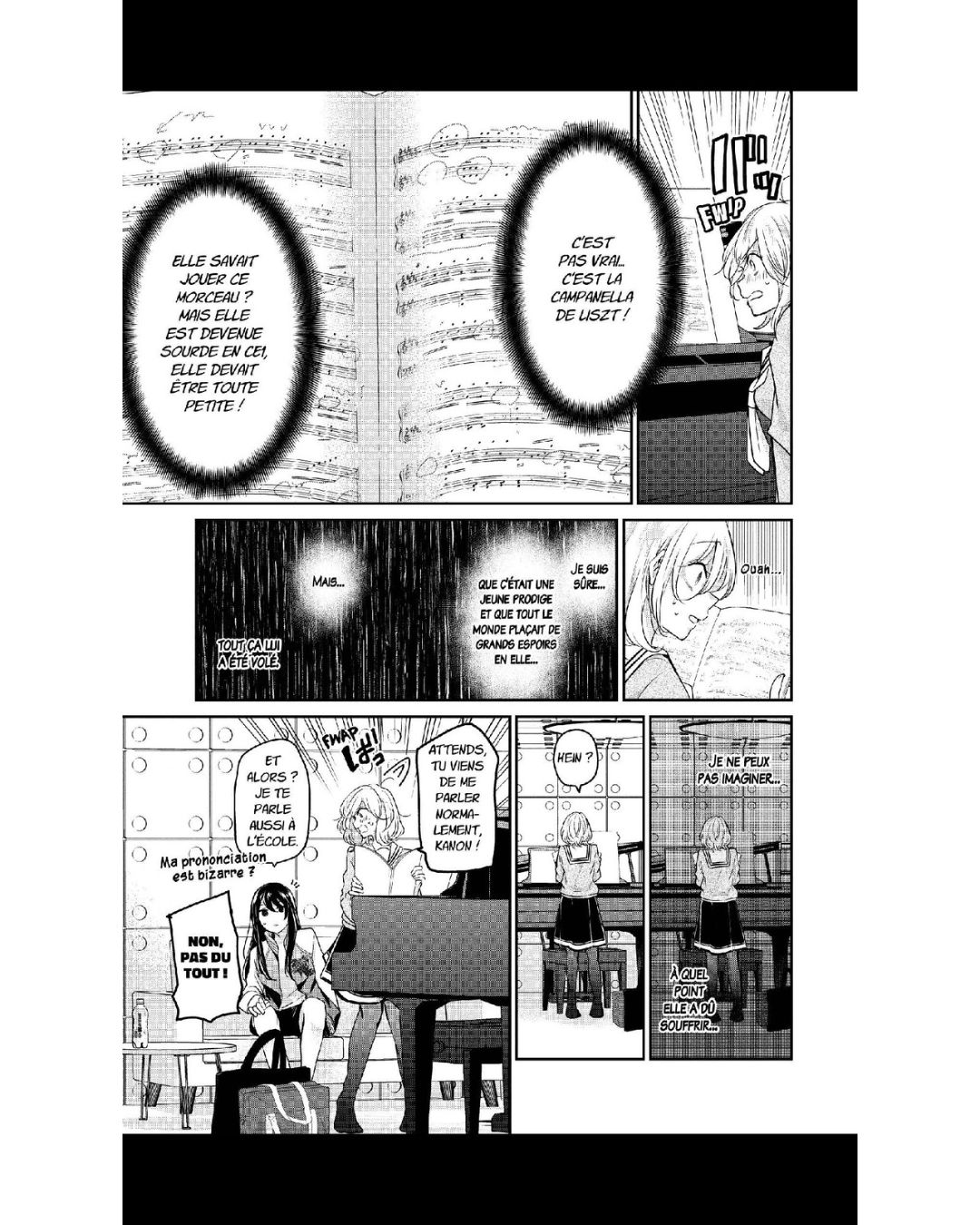 Je trouve la relation de Saki et Kanon très mignonne. On s’attache à elles. Saki essaie de tout faire pour intégrer le monde de Kanon et n’hésite pas à apprendre la langue des signes pour y arriver. On sent que l’affection qu’elle lui destine dépasse l’amitié, notamment à la dernière page, quand Saki forme le mot mariage en désignant deux femmes avec ses mains. Kanon est plus nuancée, mais il est clair que Saki compte énormément pour elle, comme lorsqu’elle dit « Je n’ai pas besoin d’amis, je t’ai toi. » Une déclaration très claire qui fait rougir Saki.