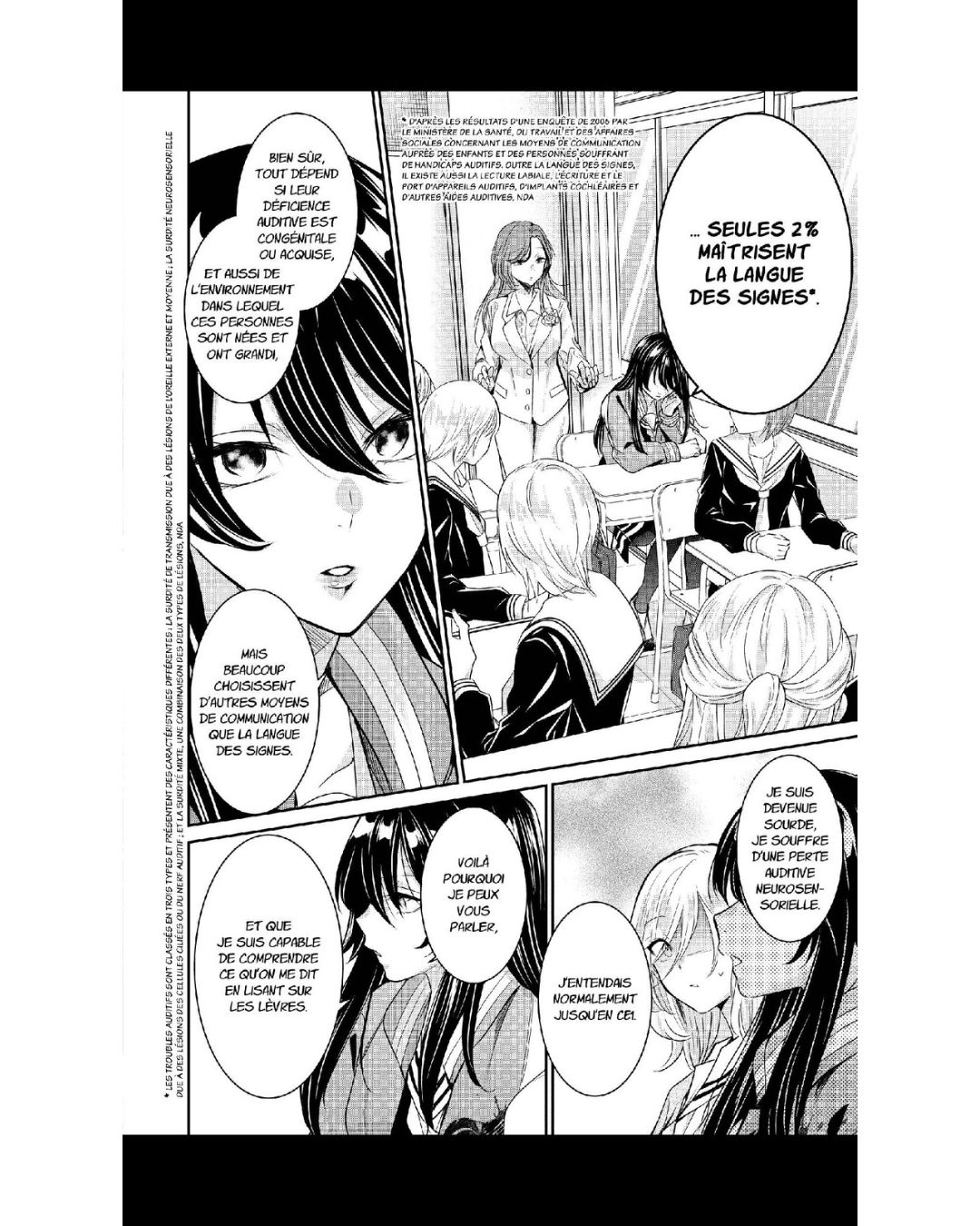 Ici, la langue des signes est introduite de manière parfaitement diégétique. Kanon refusait de l’apprendre, et c’est en regardant un drama construit autour d’un malentendant très cool qu’elle a désormais envie d’apprendre. Saviez-vous que la langue des signes diffère d’un pays à l’autre ? Je trouve ça dommage… Cela signifie qu’un sourd ne peut donc pas communiquer avec d’autres malentendants situés trop loin…