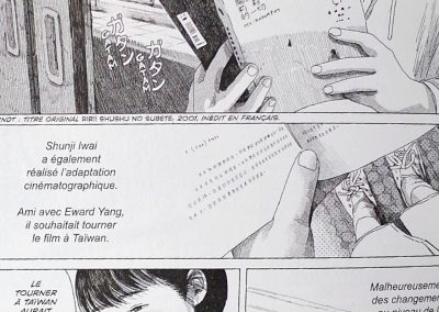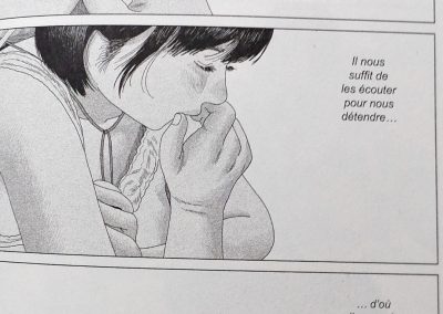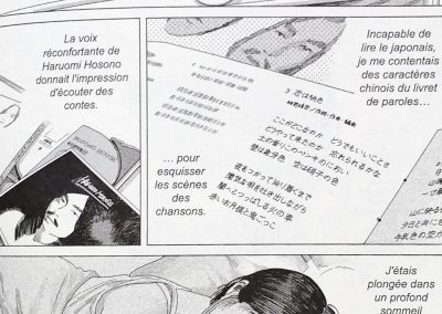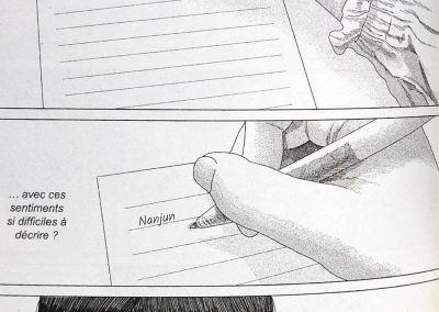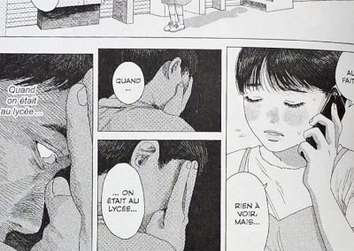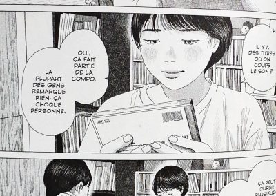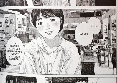 Graphiquement, les effets d’ombre et les hachures apportent du dynamisme à l’ensemble dans un style réaliste. L’auteure déploie les cases pour renforcer la contemplation : elles sont larges, permettent aux émotions de s’épanouir. Beaucoup d’entre elles ne contiennent aucun dialogue, invitant à écouter la musique intérieure de Lu. Celle qu’elle écoute, mais aussi celle de ses sentiments. Les fameux bruits blancs sont mieux expliqués dans le tome 2 et Lu compare Nanjun à son bruit blanc, capable de l’apaiser. Son amour est délicat, doux-amer, car il n’est pas réciproque.