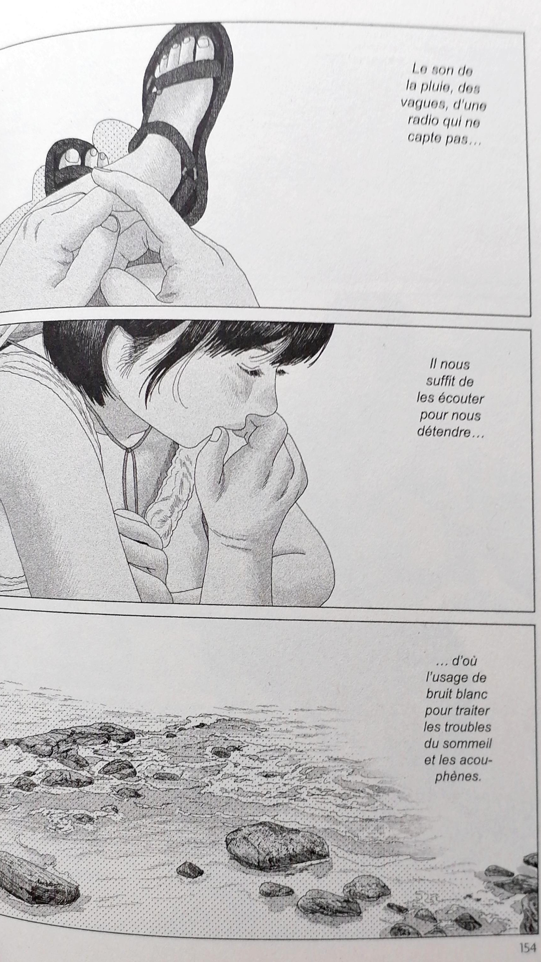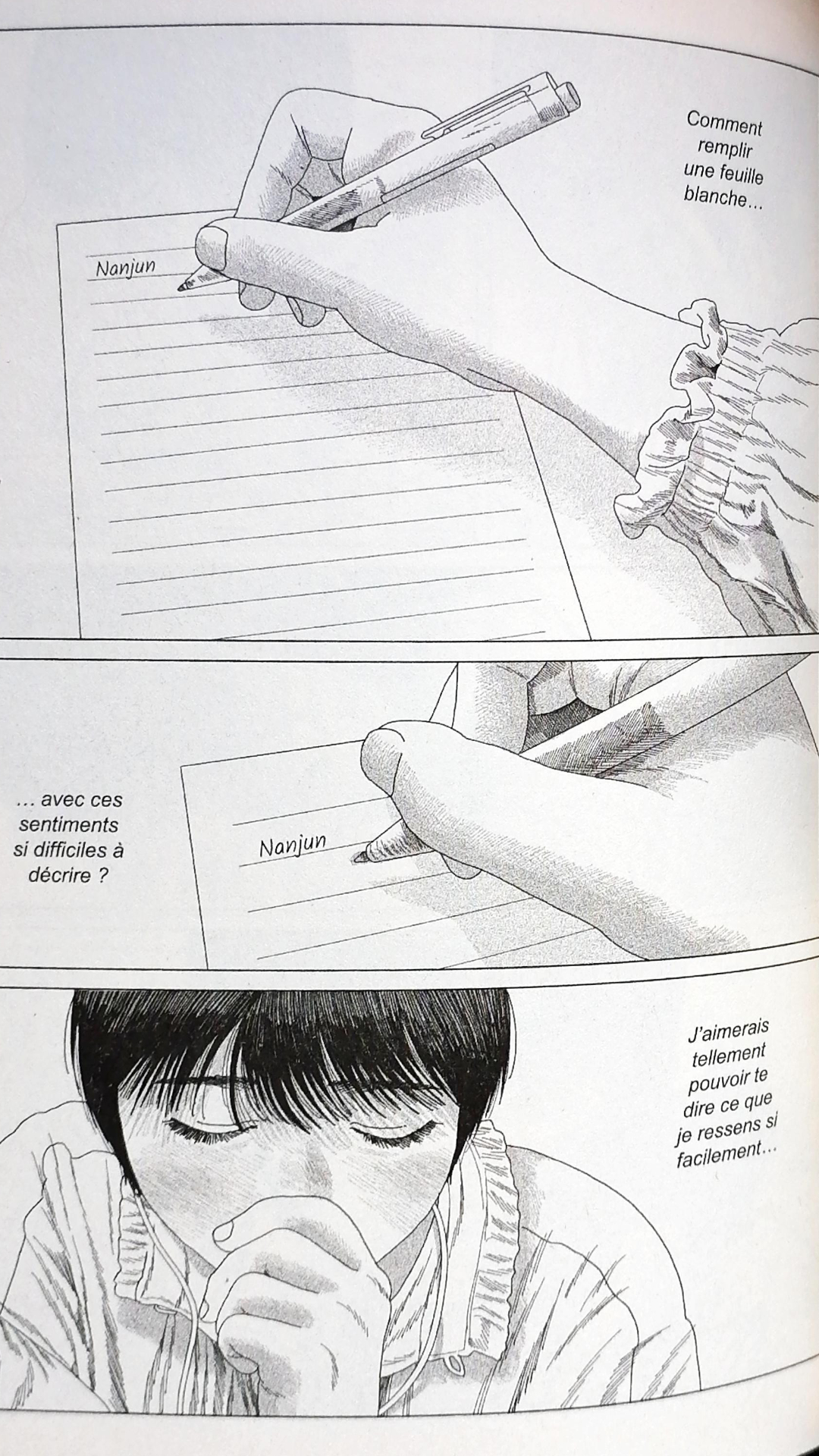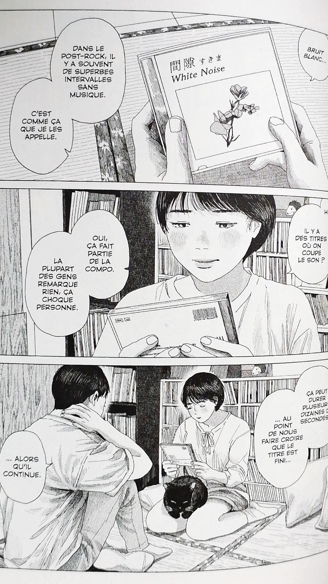 Graphiquement, les effets d’ombre et les hachures apportent du dynamisme à l’ensemble dans un style réaliste. L’auteure déploie les cases pour renforcer la contemplation : elles sont larges, permettent aux émotions de s’épanouir. Beaucoup d’entre elles ne contiennent aucun dialogue, invitant à écouter la musique intérieure de Lu. Celle qu’elle écoute, mais aussi celle de ses sentiments. Les fameux bruits blancs sont mieux expliqués dans le tome 2 et Lu compare Nanjun à son bruit blanc, capable de l’apaiser. Son amour est délicat, doux-amer, car il n’est pas réciproque.