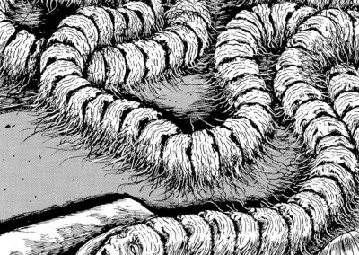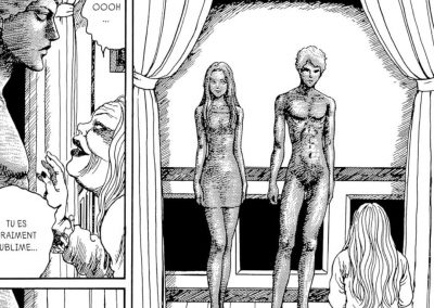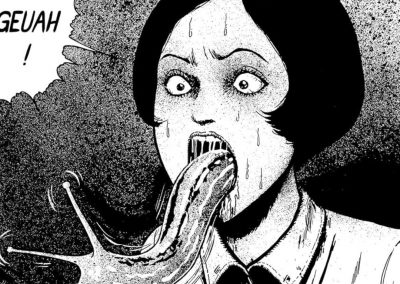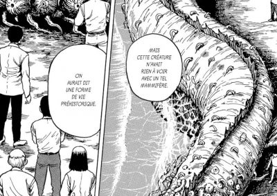 Les éléments de « body horror », marque de fabrique d’Ito, sont également bien présents. Dans le récit La femme limace, par exemple, Ito exploite la répulsion naturelle que provoque la transformation corporelle, rendant le quotidien terrifiant. Ce travail minutieux sur le corps humain, déformé et souvent grotesque, met à mal les notions de normalité et de confort, exacerbant la sensation d’inconfort chez le lecteur.