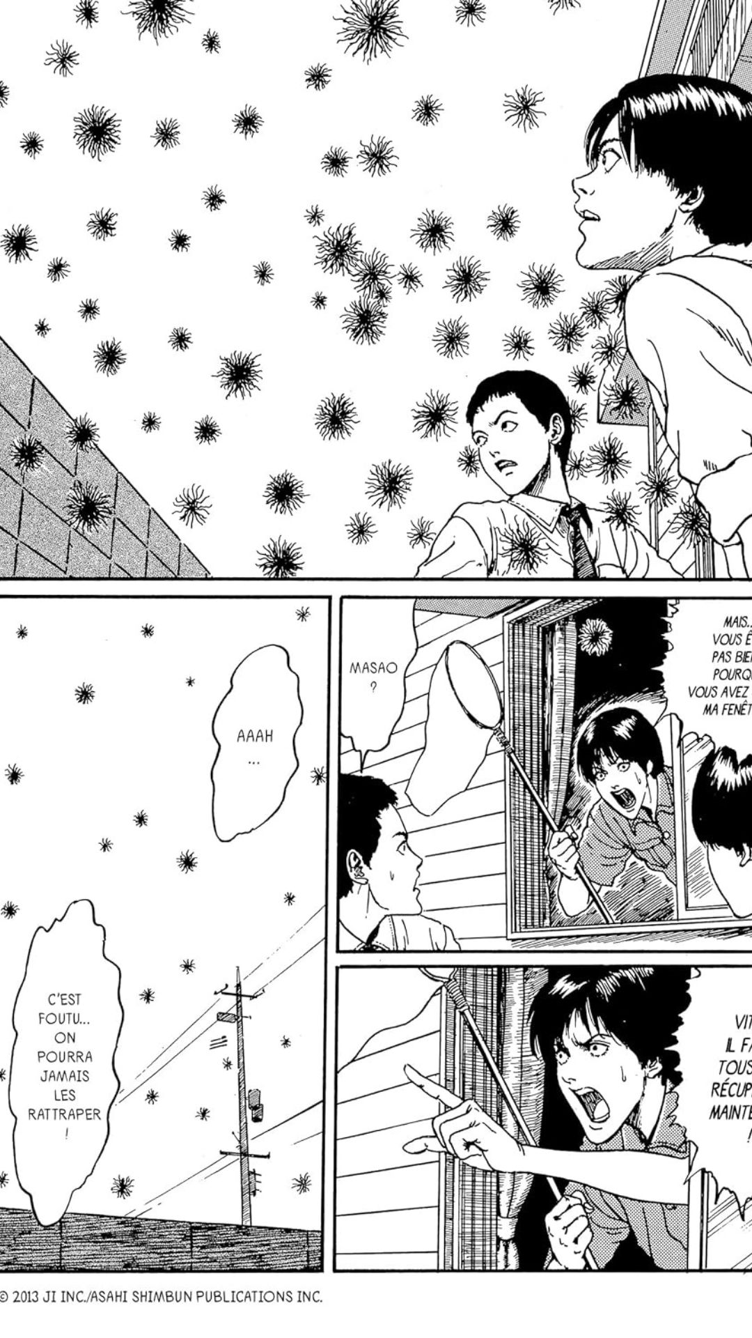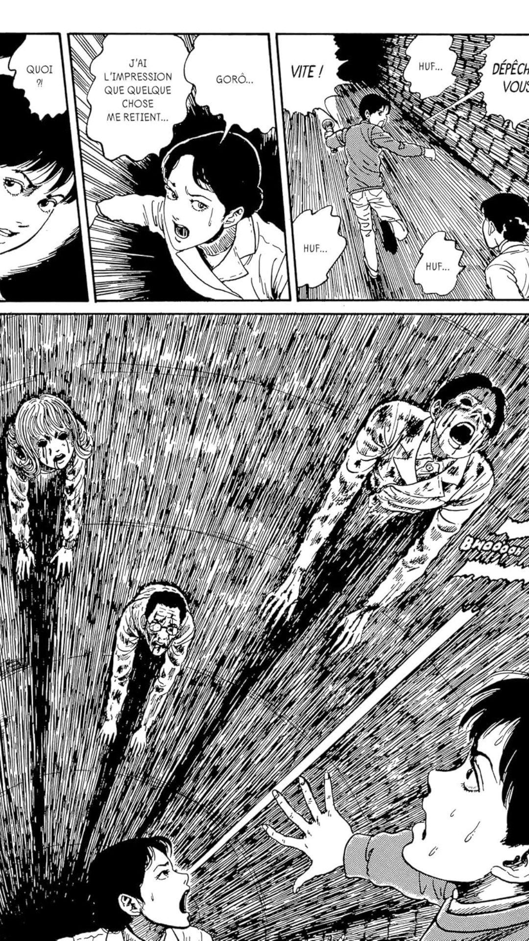 Parmi les récits marquants du recueil, La lignée et La femme limace se démarquent par des traitements variés de la transformation corporelle, une des signatures graphiques d’Ito. La lignée présente des pensées sombres et personnelles qui se matérialisent, flottant autour des personnages, tandis que La femme limace exploite l’aversion instinctive pour la transformation et la perte de contrôle sur son propre corps. Ces histoires courtes sont puissantes dans leur capacité à incarner nos peurs les plus viscérales, donnant au recueil une cohérence malgré la diversité de ses récits.