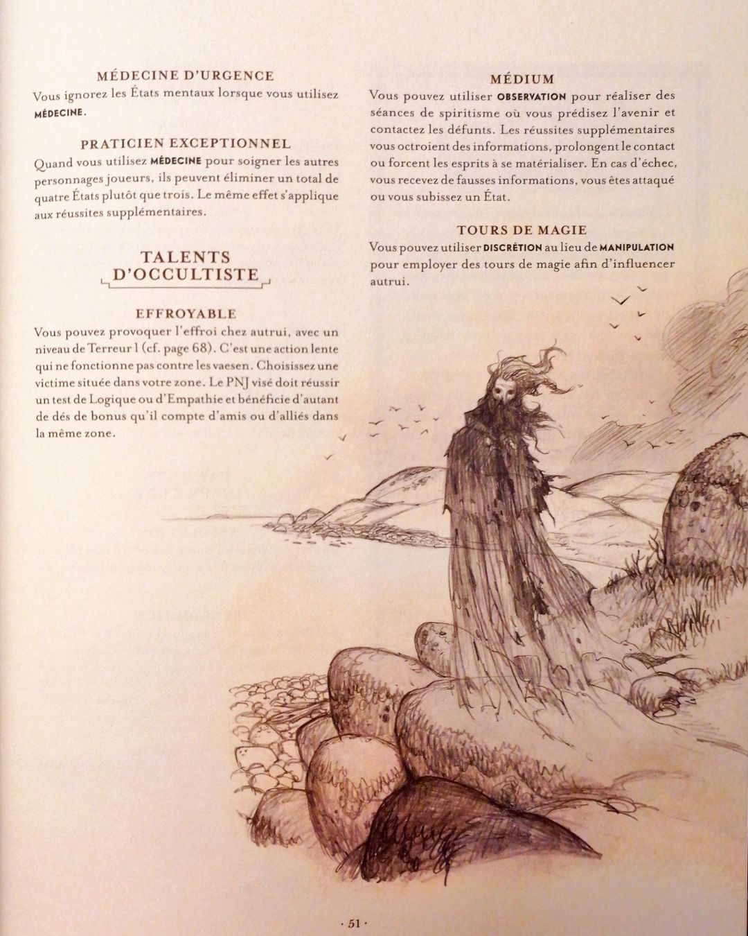 - Talents d’Occultiste : Effroyable, Médium et Tours de magie.
