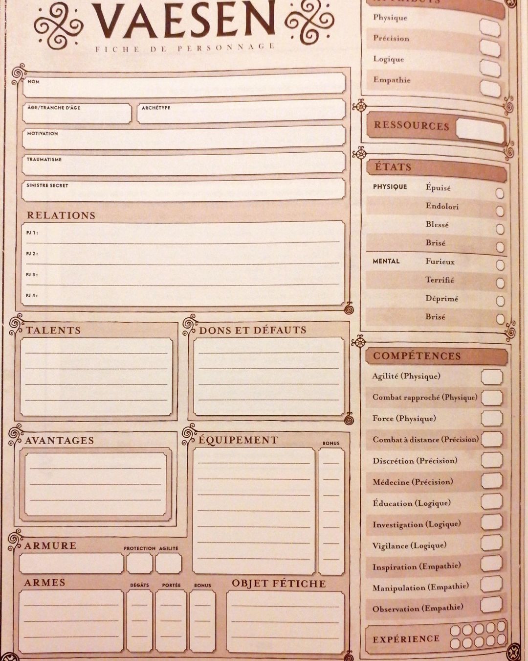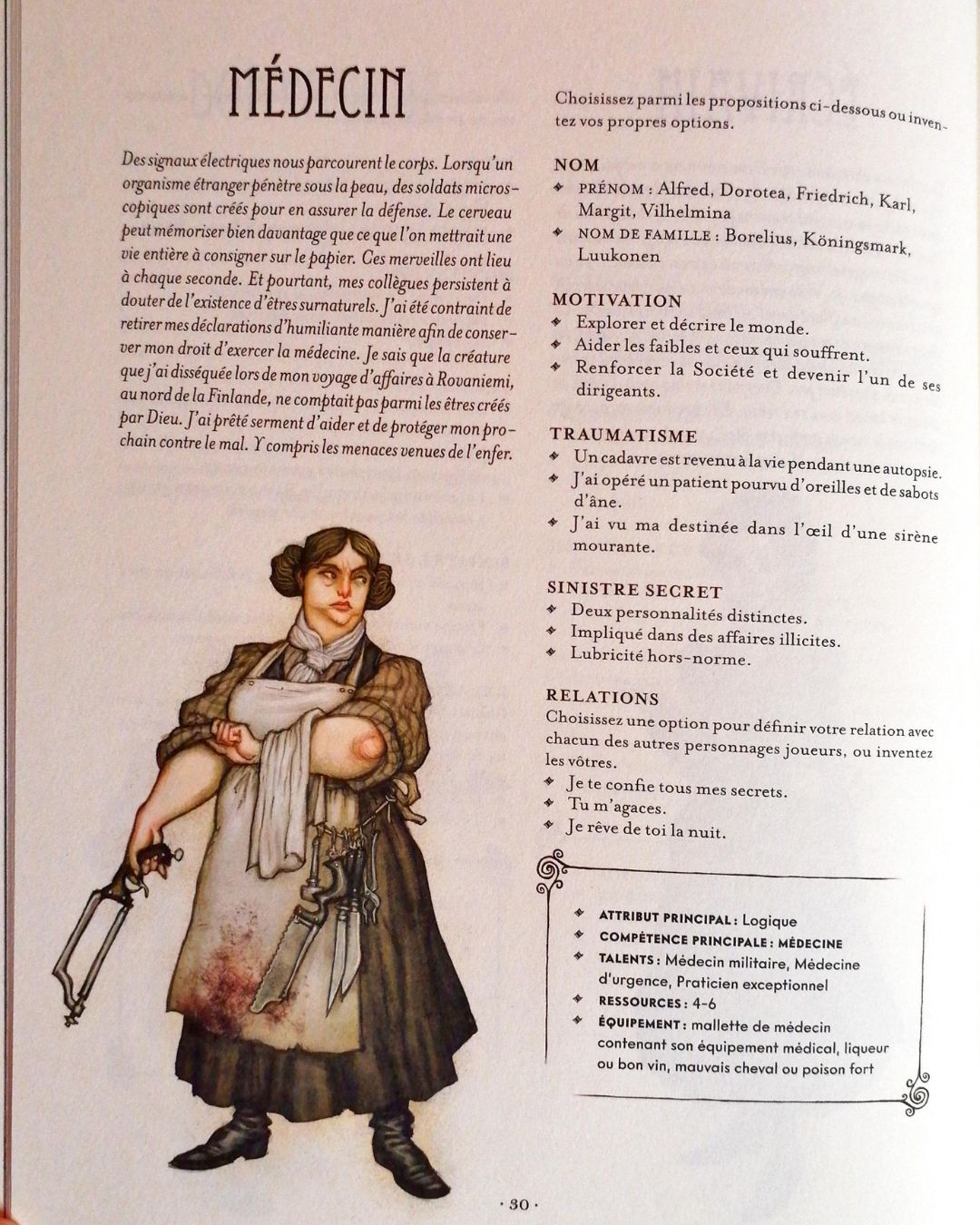 Le Traumatisme est la source de la Clairvoyance de votre personnage. Un événement fort qu’il a vécu, que ce soit dans l’enfance ou récemment, et lui a accordé le pouvoir de voir les Vaesen. Cela peut-être un Géant qui a massacré votre famille, un Revenant surgi de sa tombe, un Vaettir qui vous a maudit… Vous avez pléthore de possibilités et ce jeu de rôle vous propose 3 propositions pour chaque Archétype. Ces fameuses 3 propositions figurent également au niveau de la Motivation, du Sinistre Secret et des Relations. Il y a également 3 prénoms féminins et 3 prénoms masculins ainsi que 3 noms de famille pour vous aiguiller si vous ne savez pas quel nom choisir.
