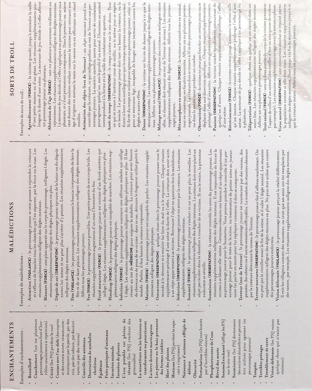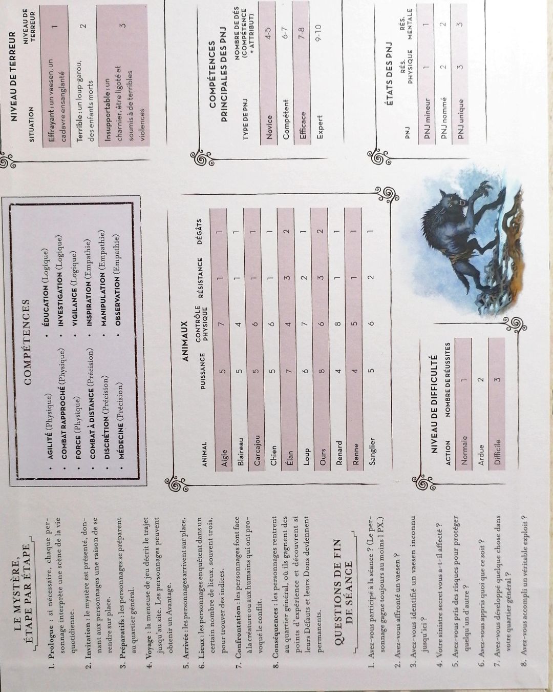 Concernant l’écran du Maître de Jeu, il récapitule le Mystère en 8 étapes : Prologue, Invitation, Préparatifs, Voyage, Arrivée, Lieux, Confrontation et Conséquences. Il inclut également 8 questions à poser en fin de séance pour noter l’avancée du scénario. On y trouve aussi un encart sur les Compétences, les Animaux, le Niveau de difficulté, le Niveau de Terreur, les Compétences principales des PNJ, les États des PNJ. Actions lentes typiques, Actions rapides typiques, Abri, Armures, Résumé des soins médicaux. Enchantements, Malédictions et Sorts de Troll. Ces trois dernières sections sont les plus fournies.